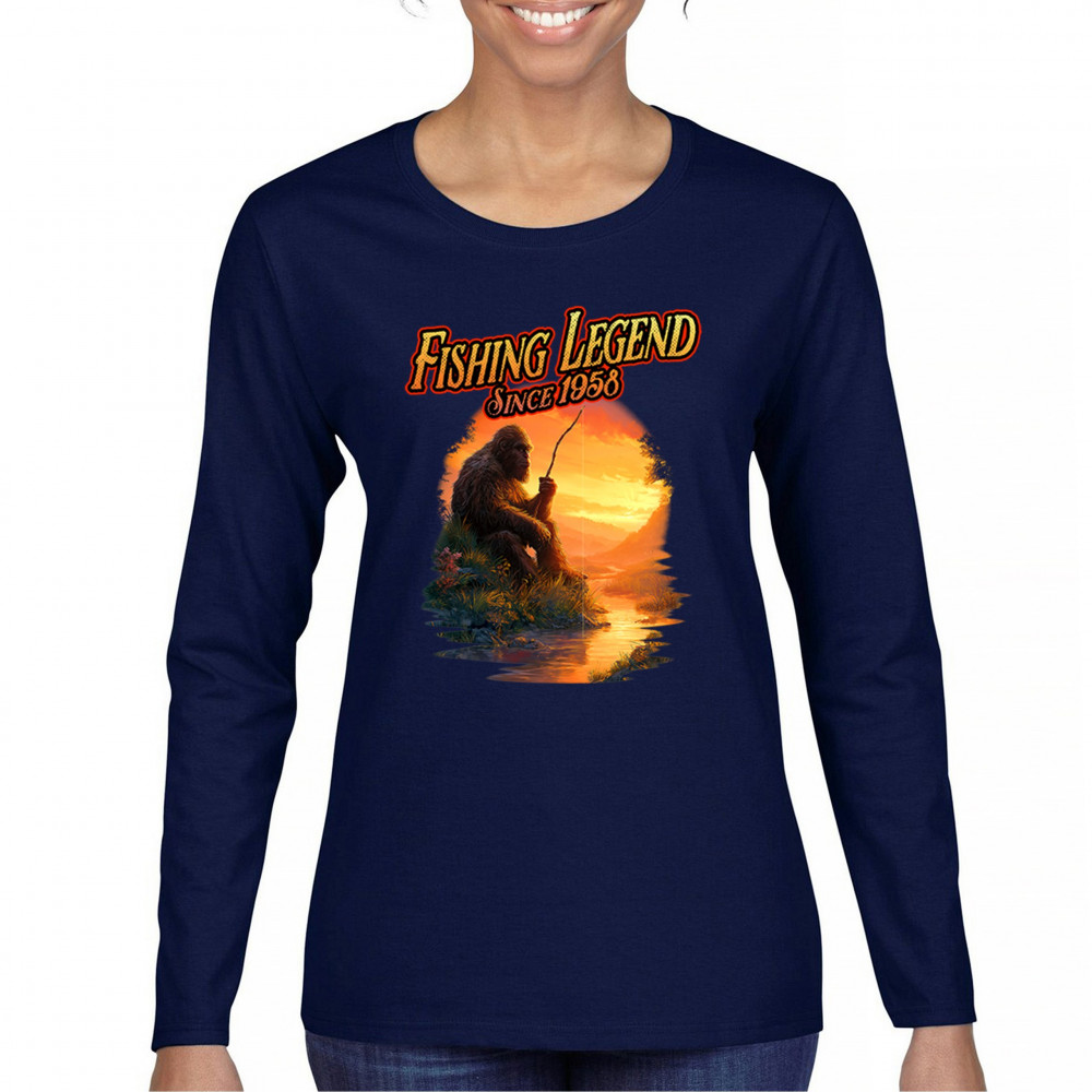 Bigfoot fishing legend design with Sasquatch lifestyle, retro vintage humor, funny wilderness shirt, Father’s Day gift, and campfire style.