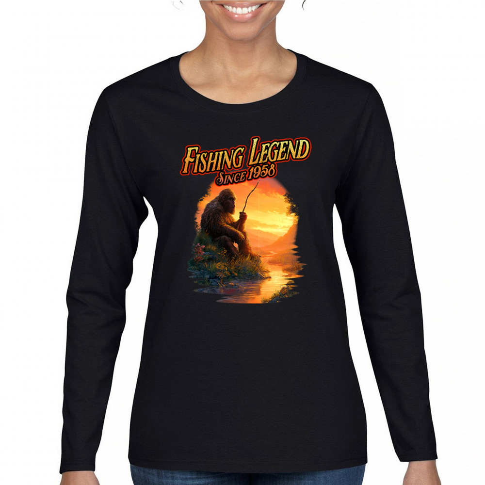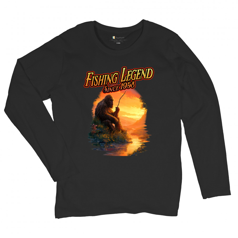 Bigfoot fishing legend design with Sasquatch lifestyle, retro vintage humor, funny wilderness shirt, Father’s Day gift, and campfire style.
