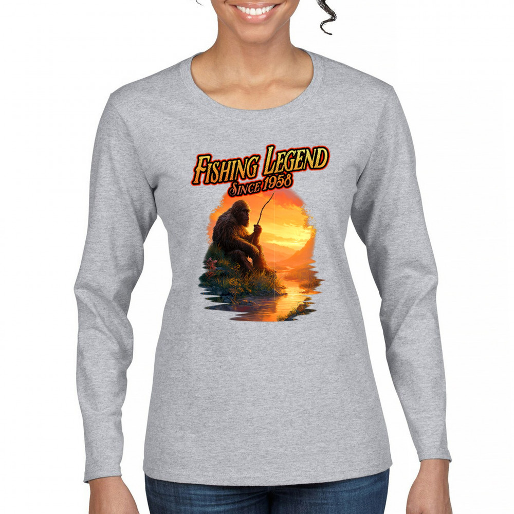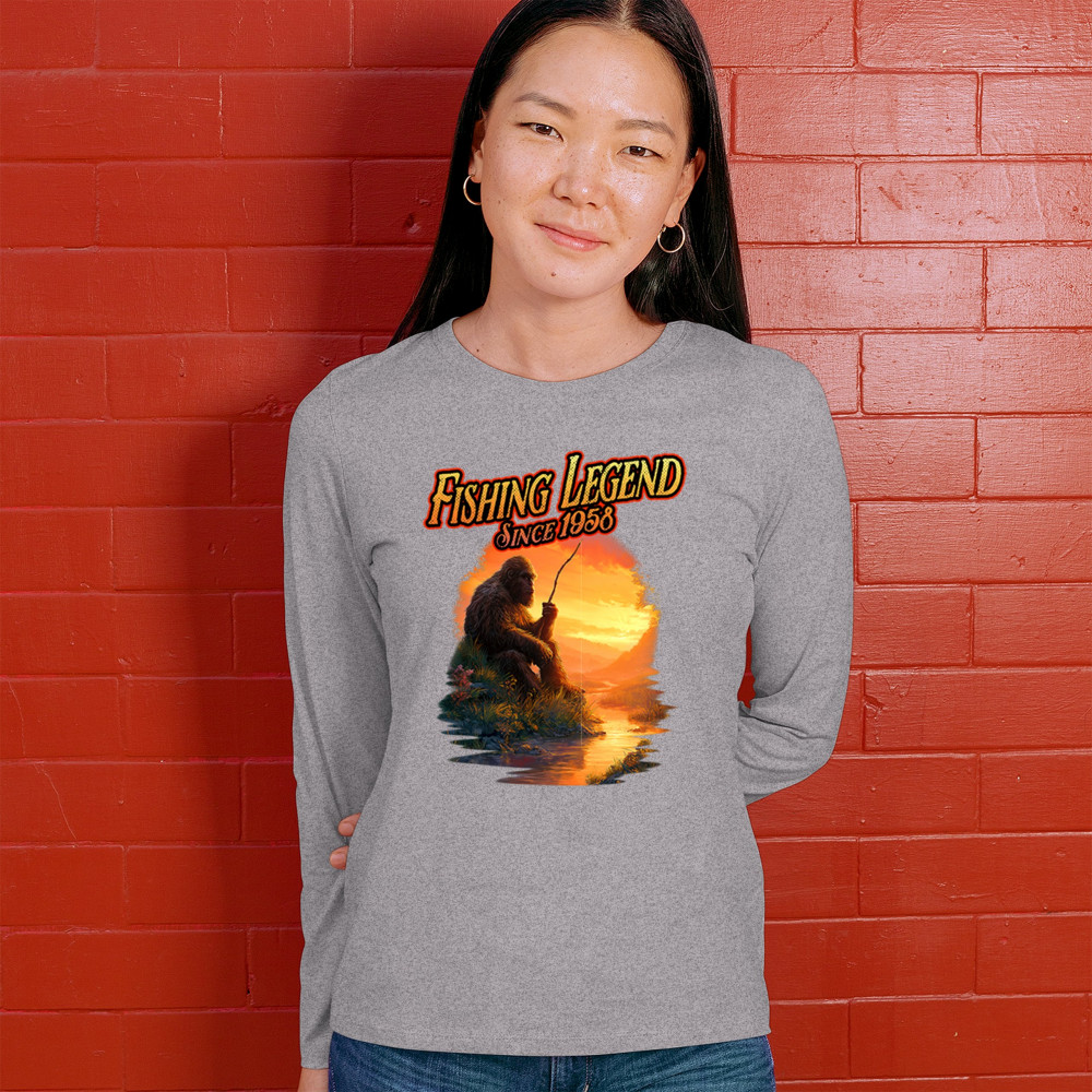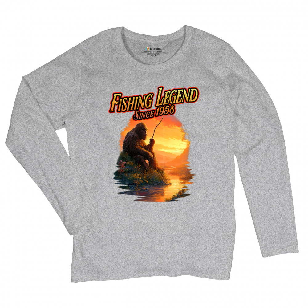 Bigfoot fishing legend design with Sasquatch lifestyle, retro vintage humor, funny wilderness shirt, Father’s Day gift, and campfire style.