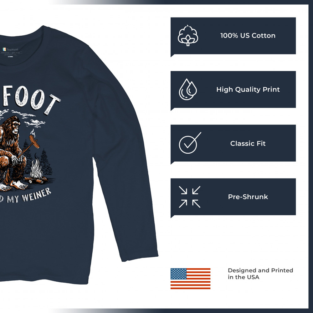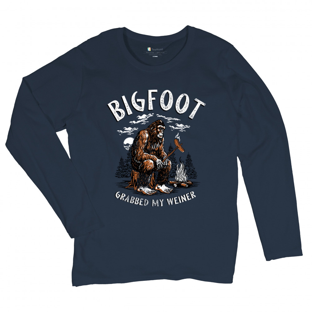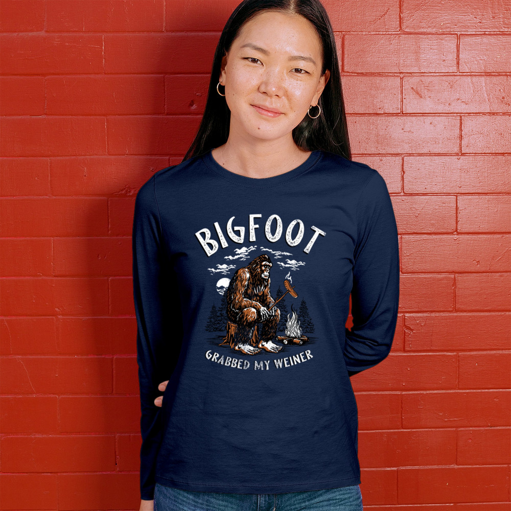 The Bigfoot Grabbed My Weiner design brings cheeky campfire humor to your outdoor adventures. Featuring a cartoon-style Sasquatch roasting a sausage by the fire, it’s perfect for cryptid lovers, campers, and jokesters. Ideal for BBQs, bonfires, forest festivals, and anyone who enjoys weiner jokes with their wilderness.