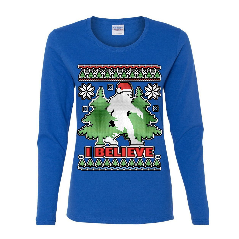 I BELIEVE bigfoot ugly sweatshirt women's long sleeve tee funny christmas yeti royal blue