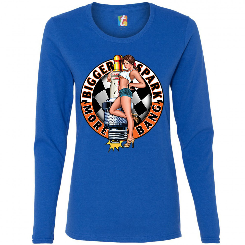 BIGGER SPARK MORE BANG women's long sleeve t-shirt pin-up girl vintage racing royal blue
