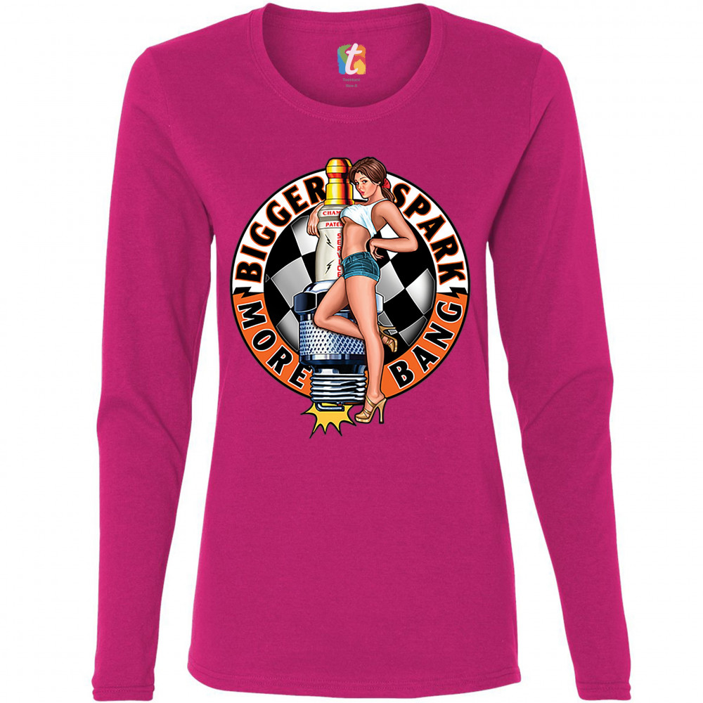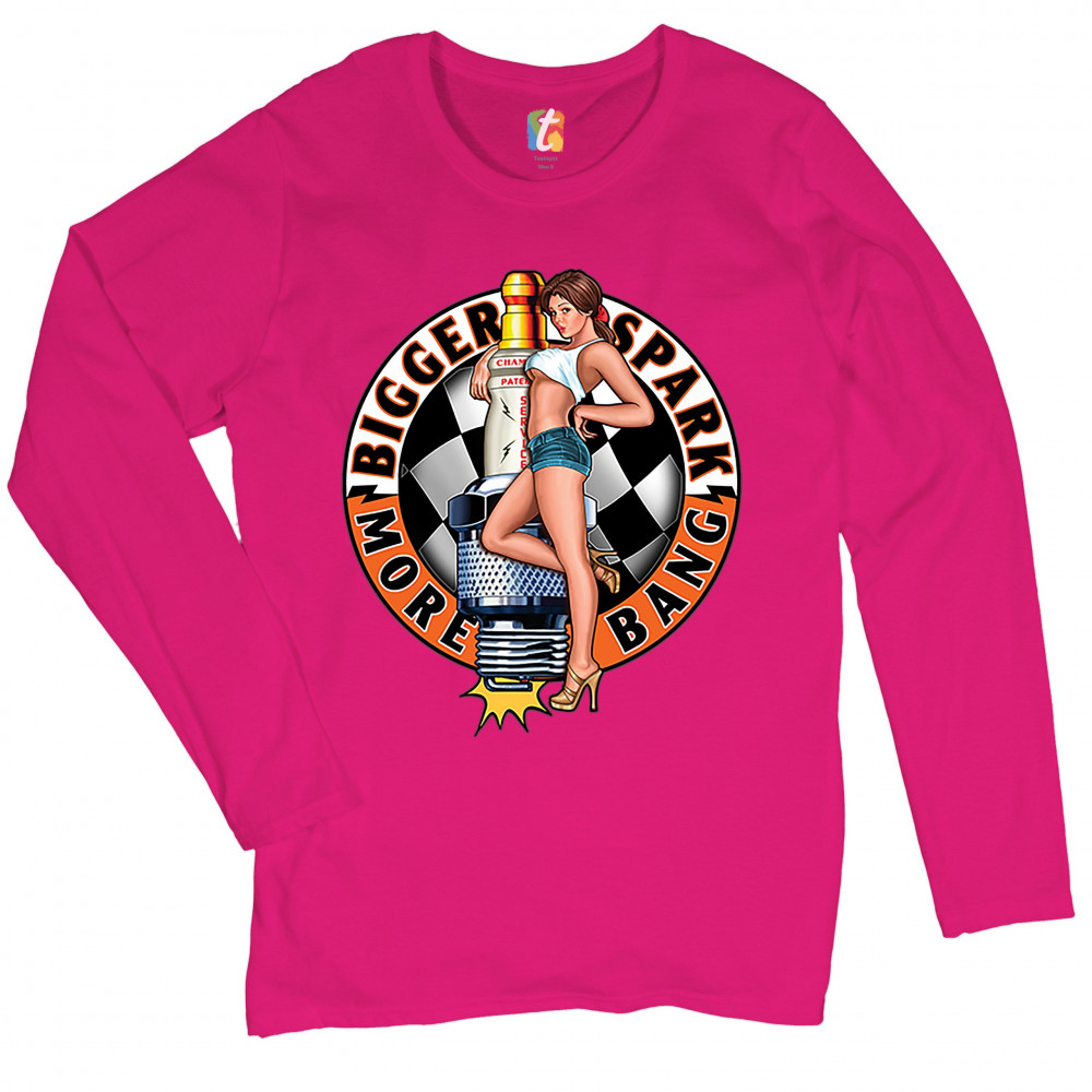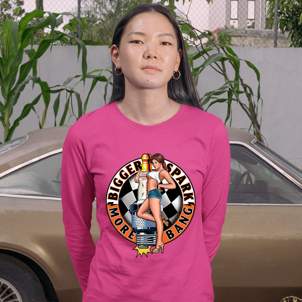 BIGGER SPARK MORE BANG women's long sleeve t-shirt pin-up girl vintage racing pink