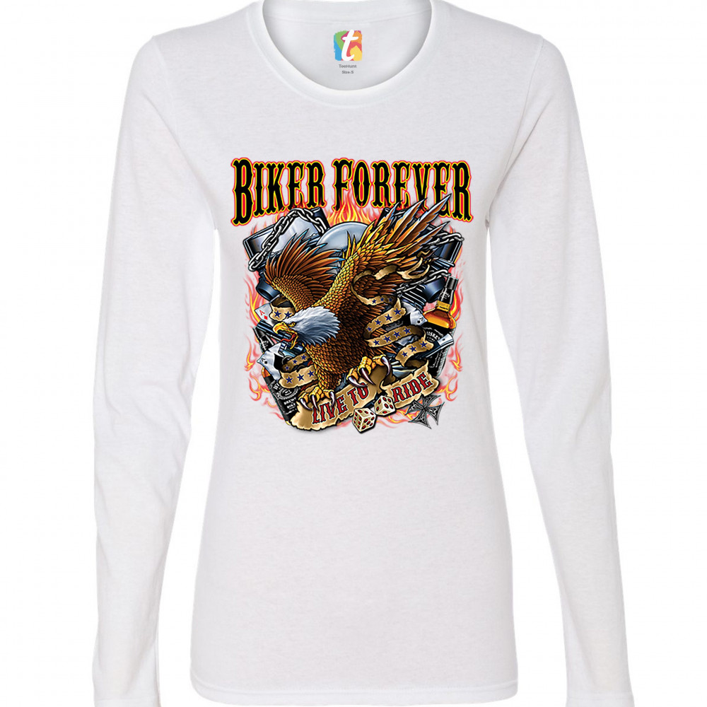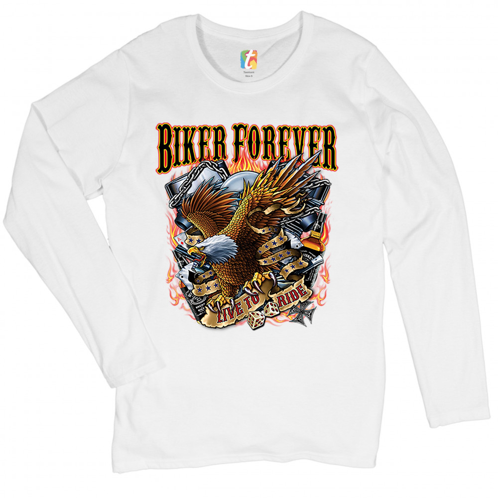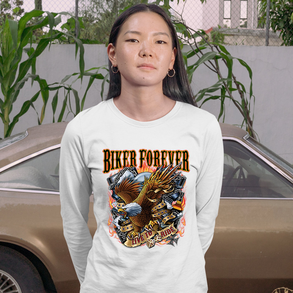 BIKER FOREVER LIVE TO RIDE women's long sleeve t-shirt bald eagle motorcycle white