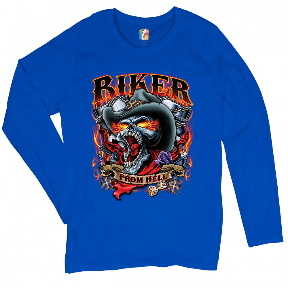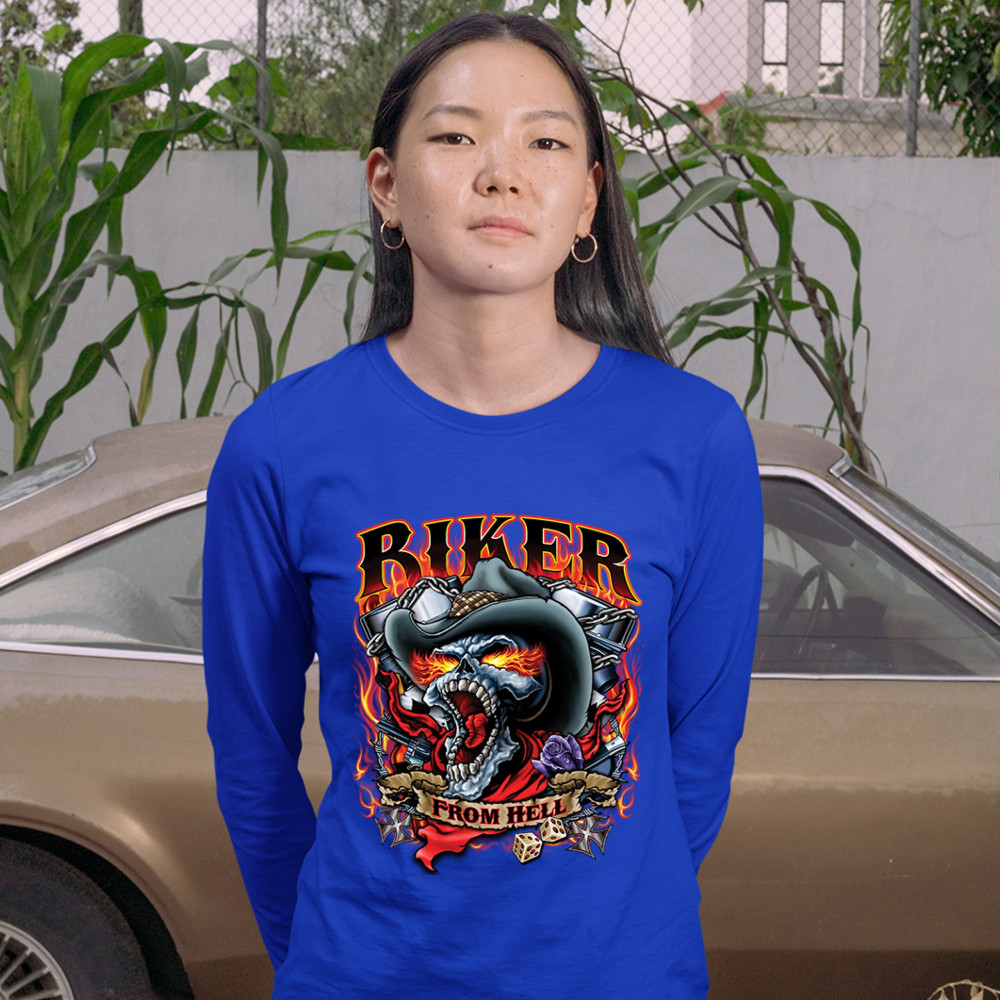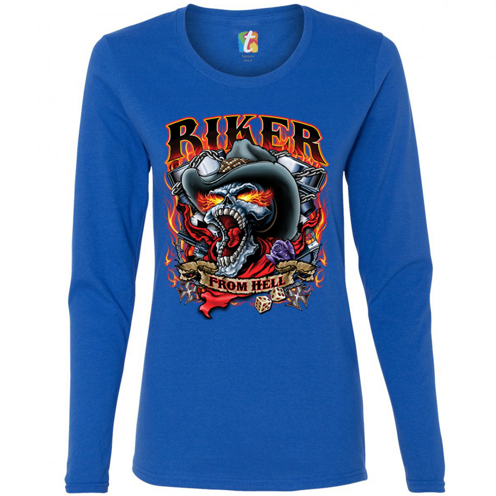BIKER FROM HELL women's long sleeve t-shirt ride or die skeleton outlaw rte 66 royal blue