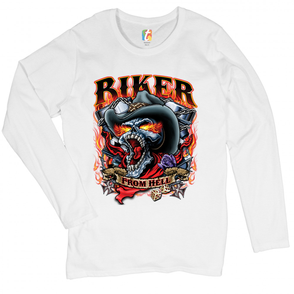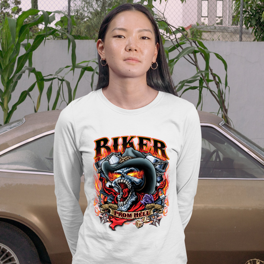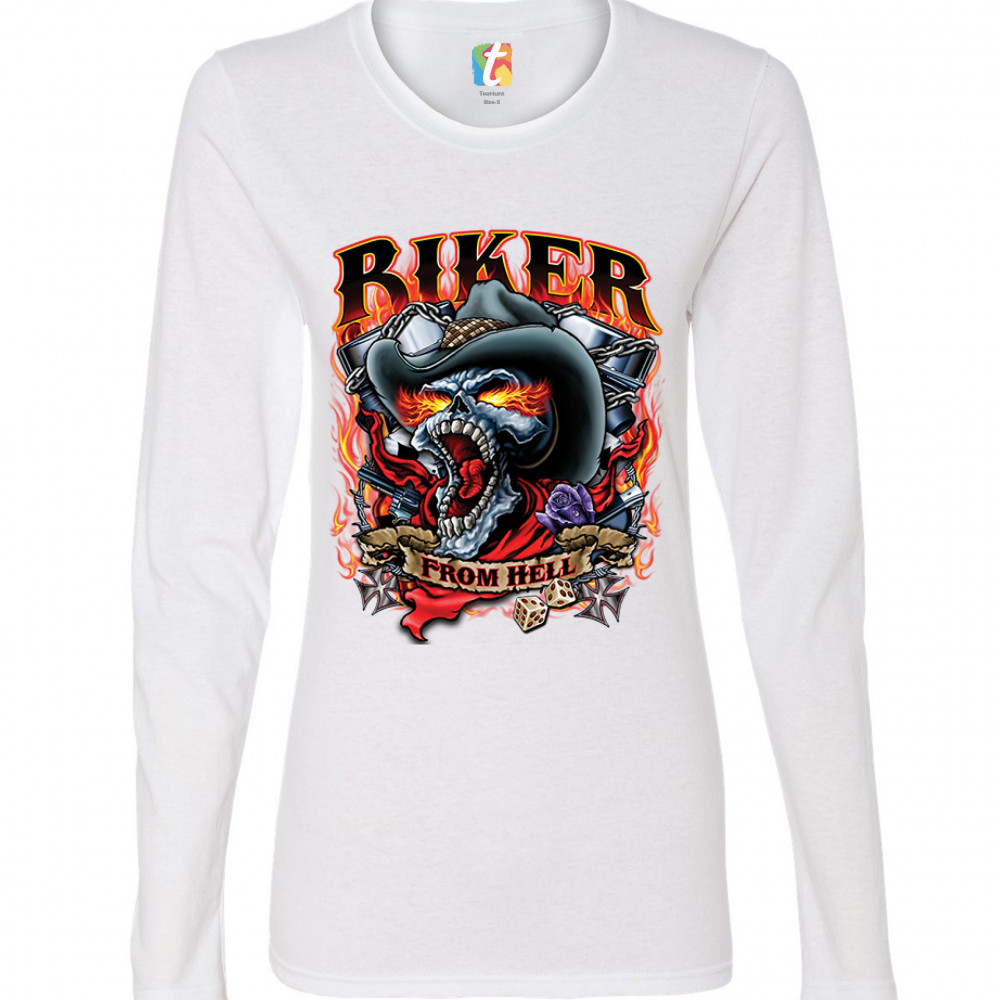 BIKER FROM HELL women's long sleeve t-shirt ride or die skeleton outlaw rte 66 white