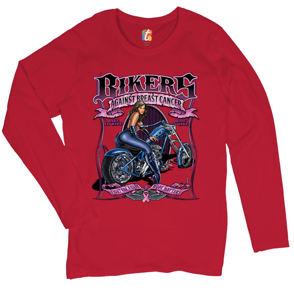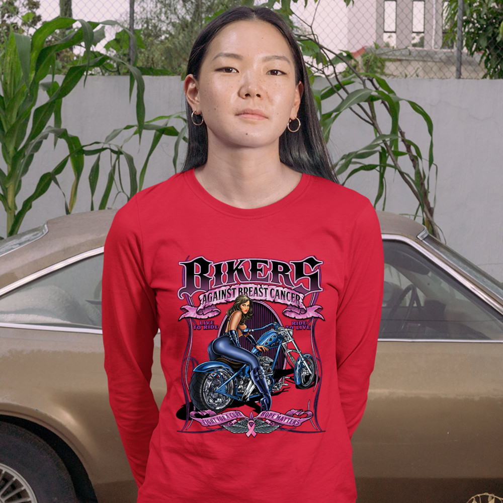 A print featuring a badass biker chick leaning on a chopper. The print says: "Bikers against breast cancer. Live to ride. Ride to live." At the bottom of the print there are two stripes with "fight for a cure, hope matters" written on them. Between the st