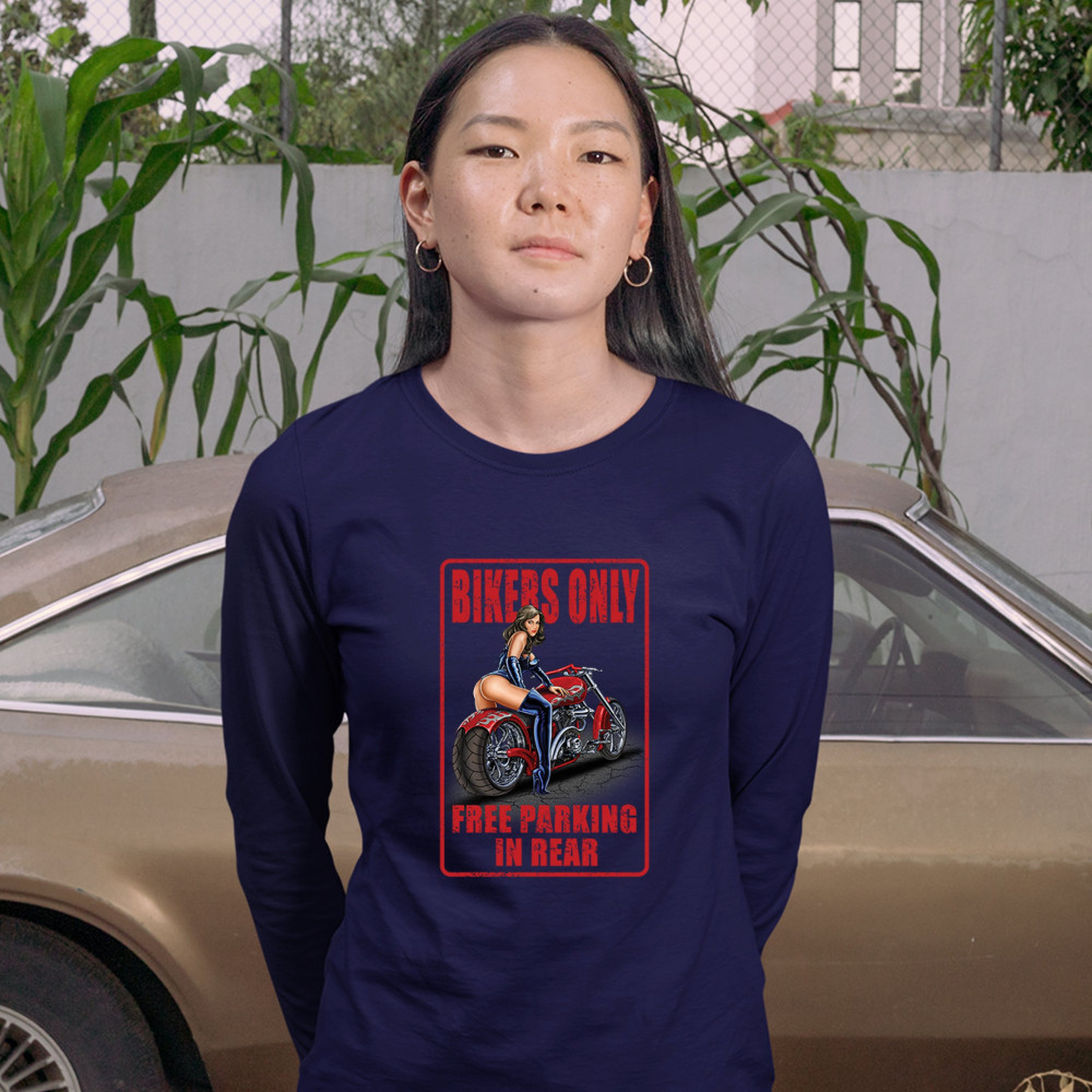 BIKERS ONLY FREE PARKING IN REAR women's long sleeve t-shirt pin-up biker chick navy blue