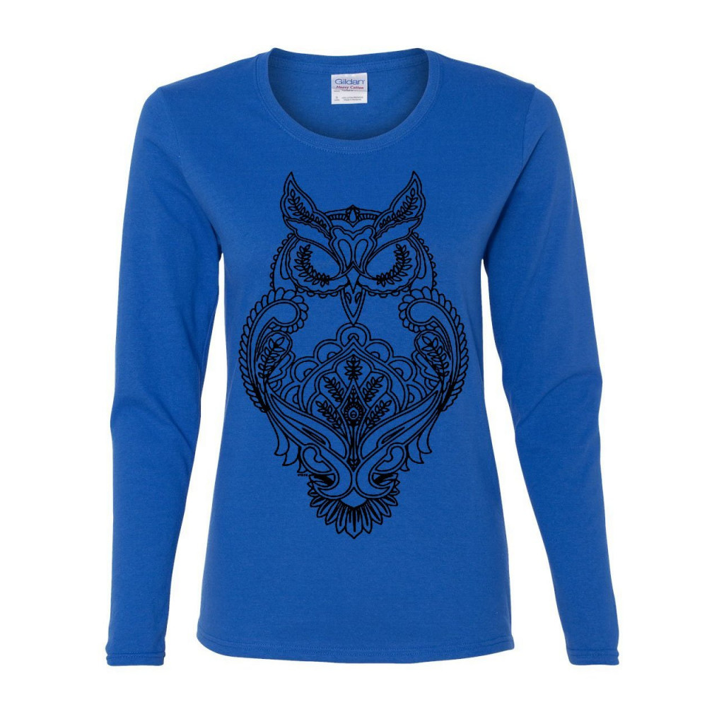 BLACK OWL HENNA STYLE women's long sleeve tee wildlife nature knowledge wisdom royal blue