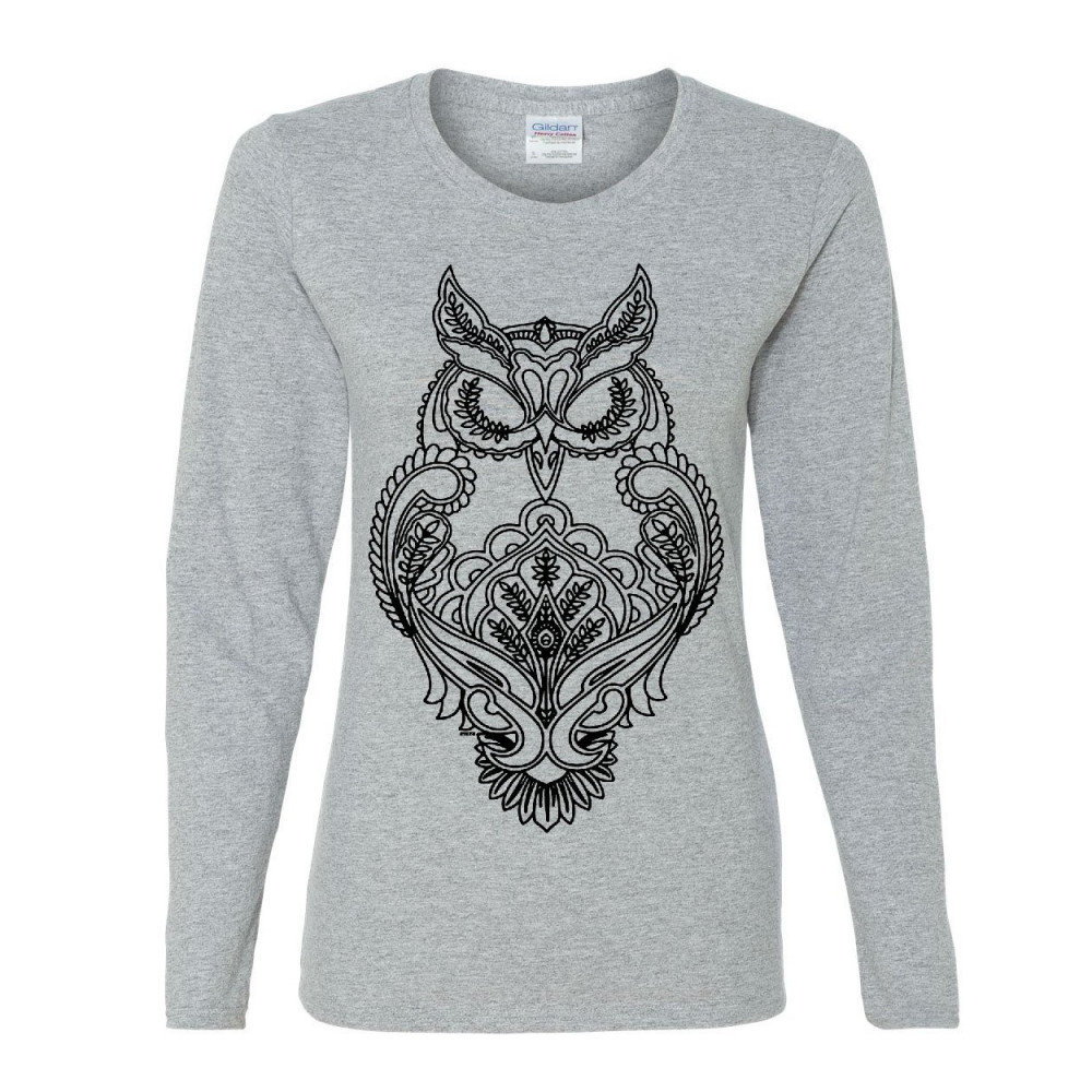 BLACK OWL HENNA STYLE women's long sleeve tee wildlife nature knowledge wisdom gray