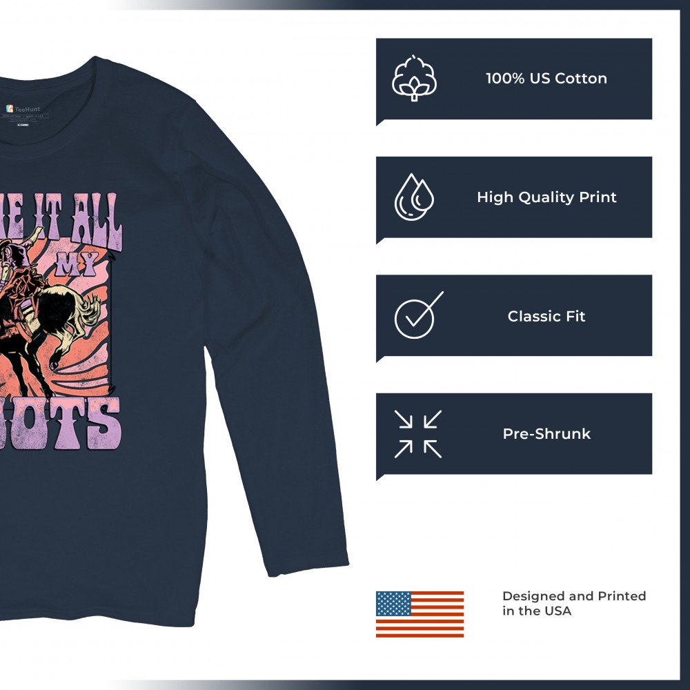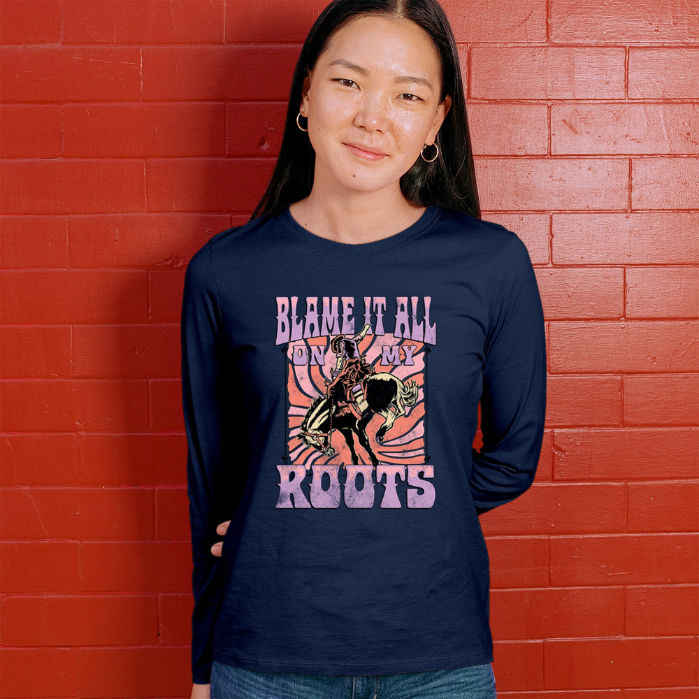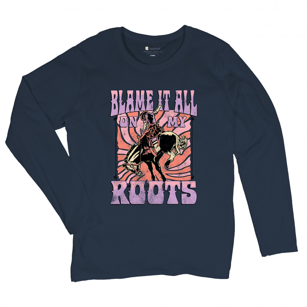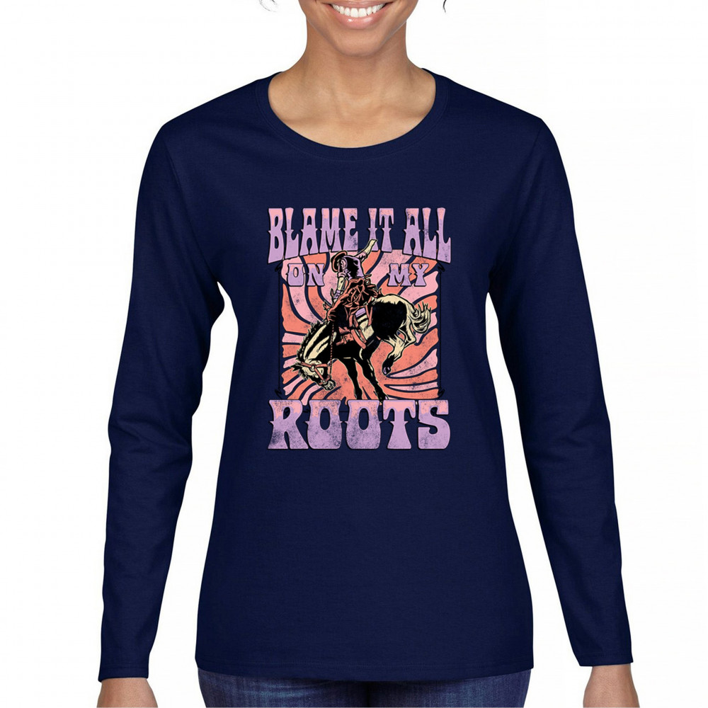 Blame It All On My Roots is vintage country style with rodeo spirit, perfect for small town life, barn dances, and wild country pride.