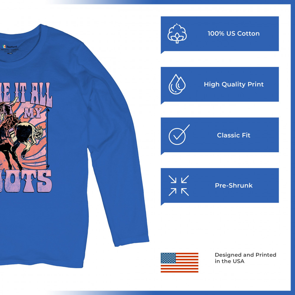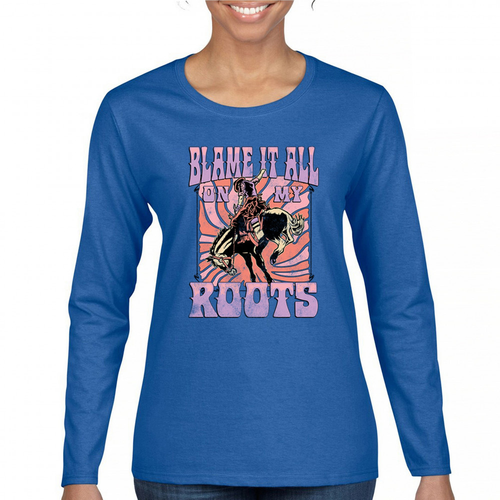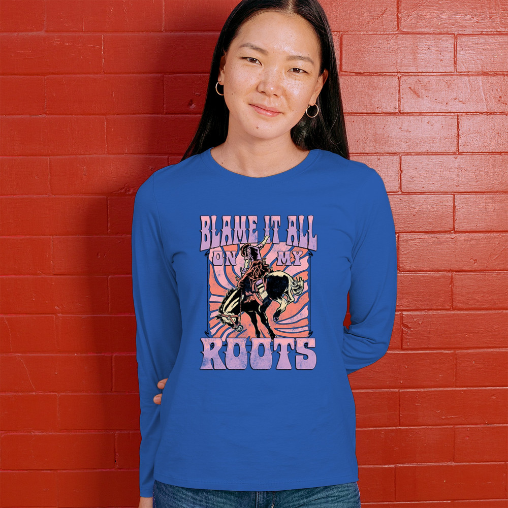 Blame It All On My Roots is vintage country style with rodeo spirit, perfect for small town life, barn dances, and wild country pride.