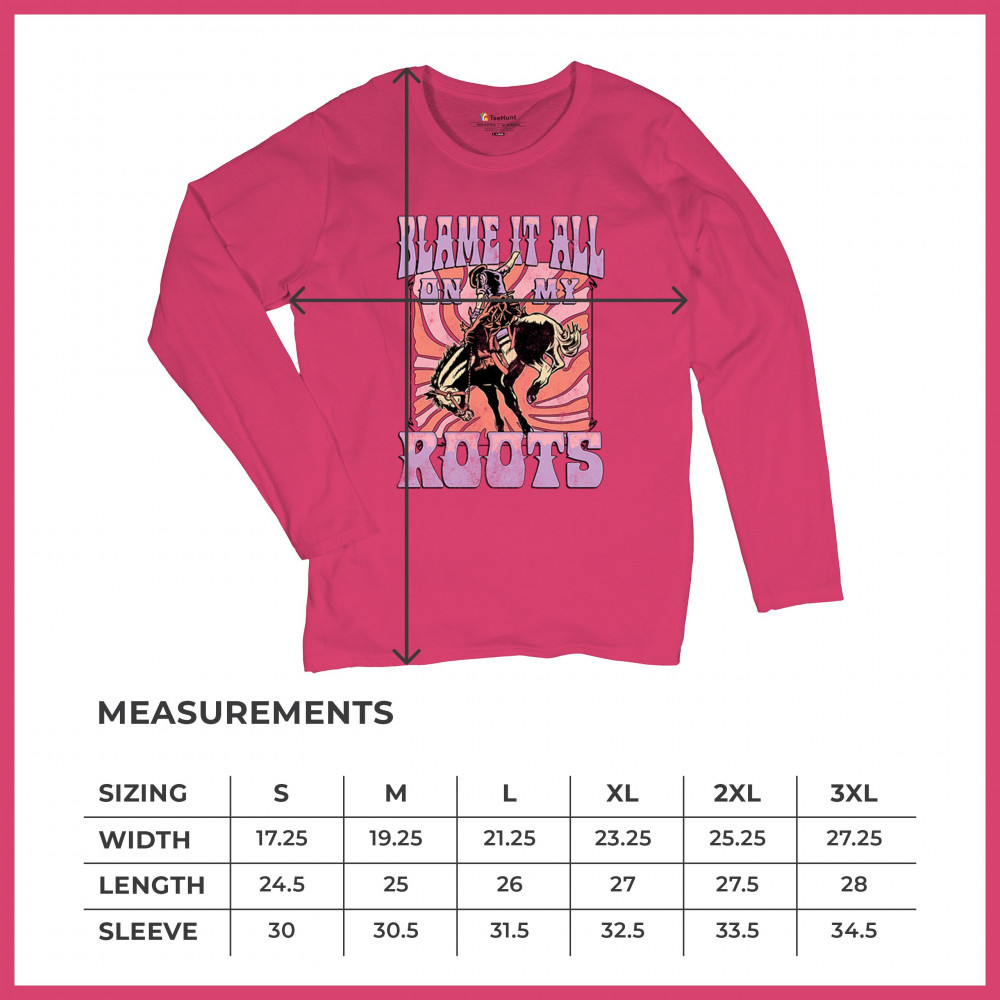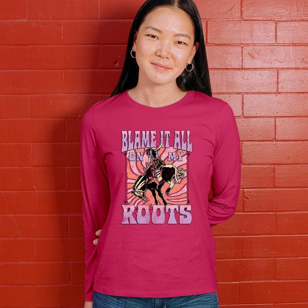 Blame It All On My Roots is vintage country style with rodeo spirit, perfect for small town life, barn dances, and wild country pride.