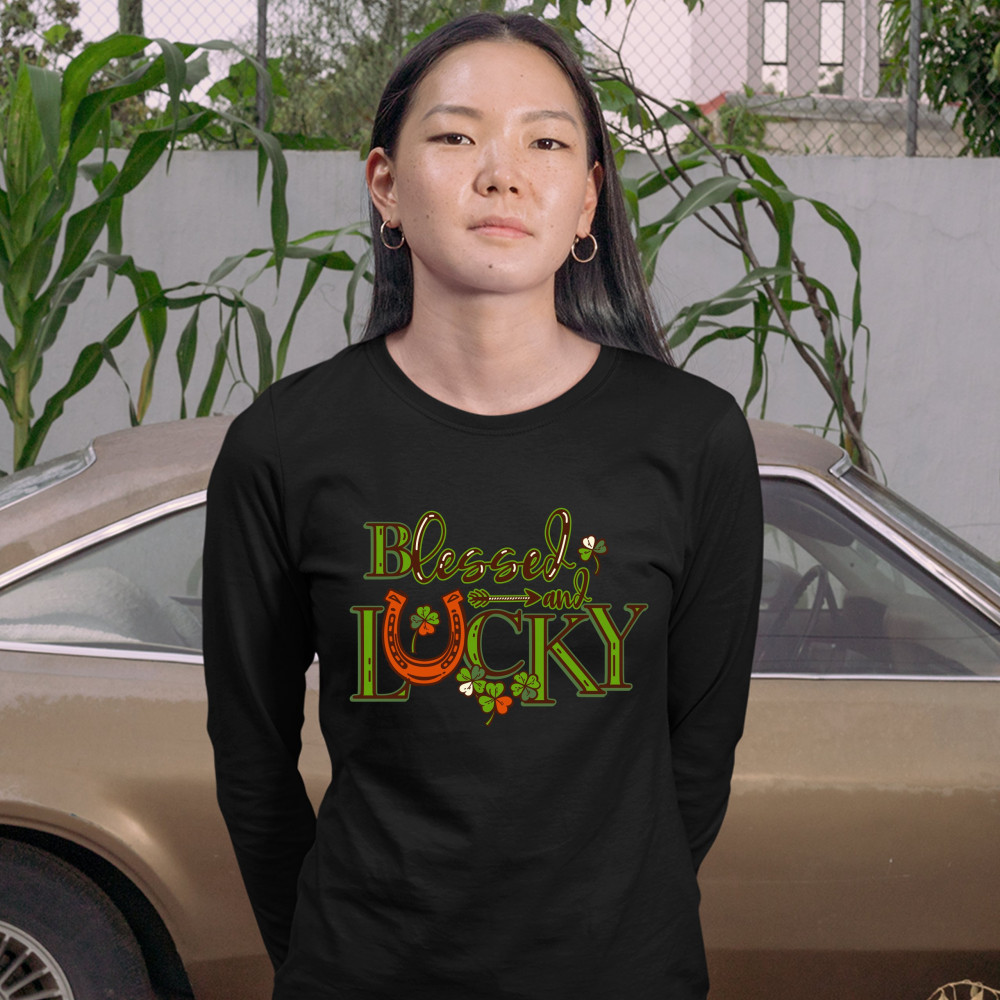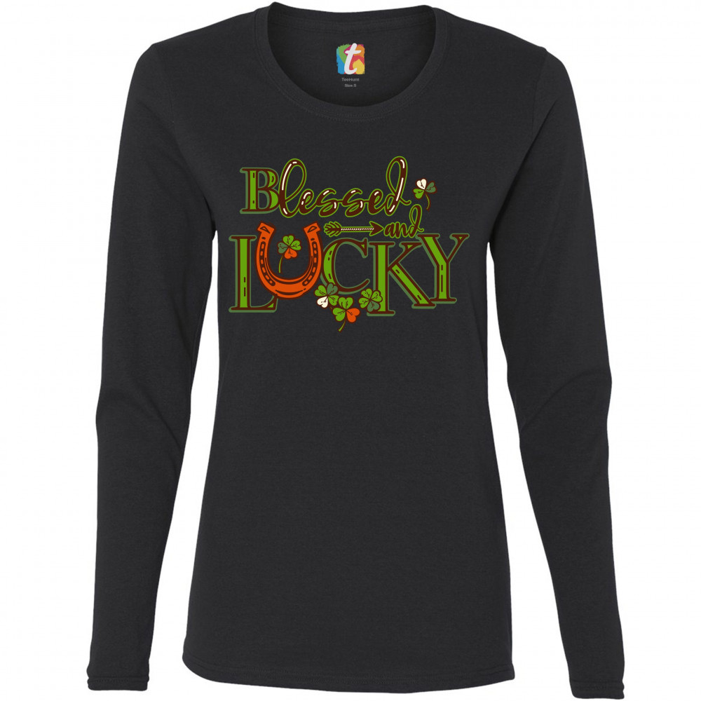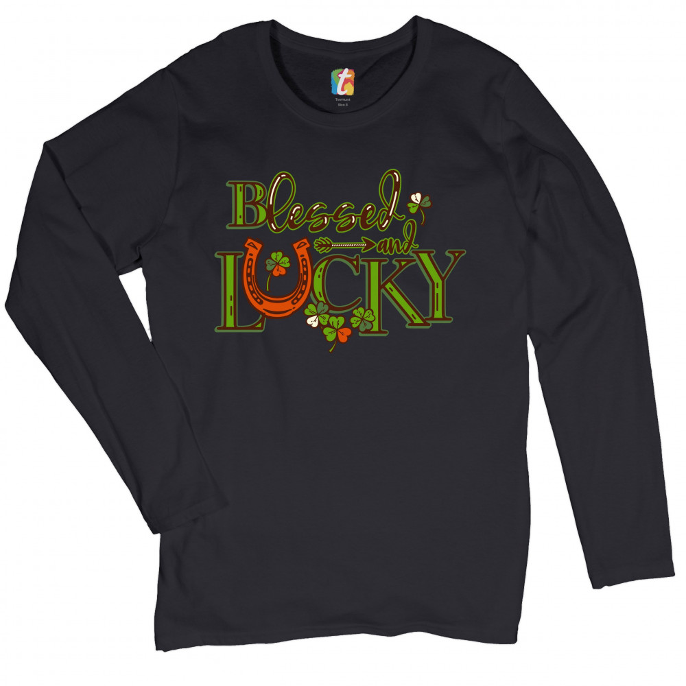 BLESSED AND LUCKY women's long sleeve t-shirt st. patrick's day clover irish black