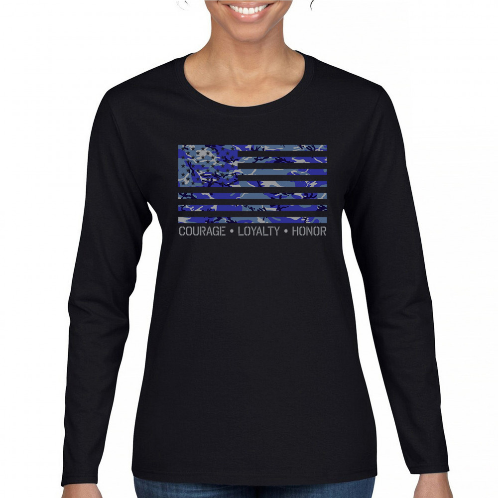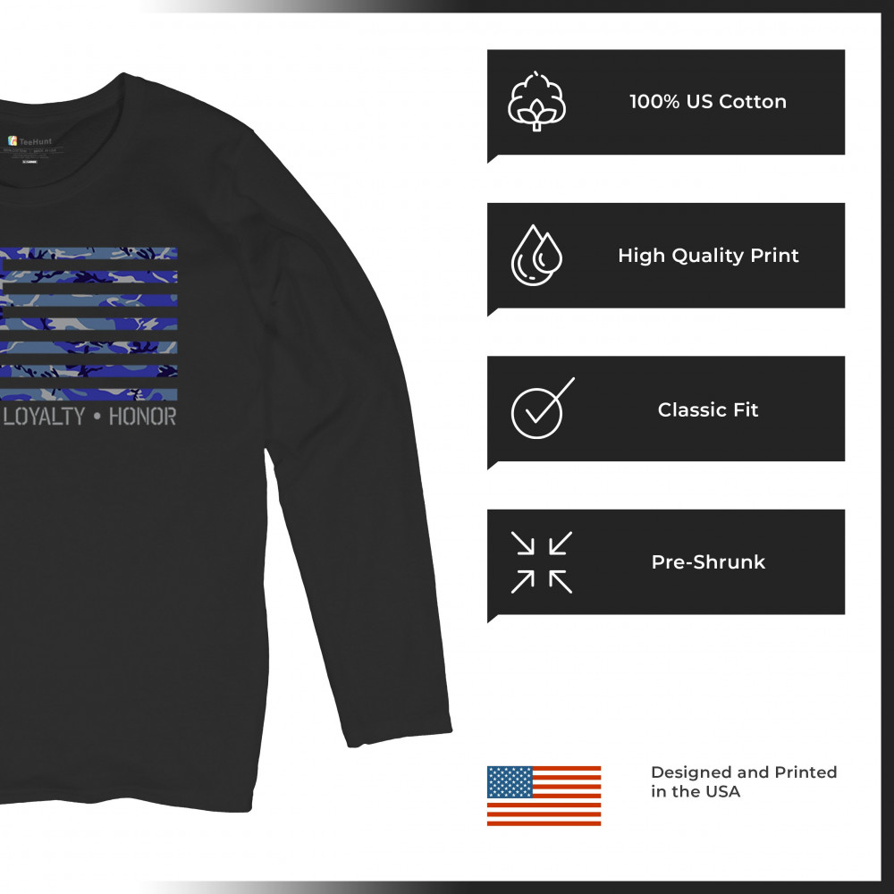 Patriotic shirt with blue camouflage USA flag and "Courage, Loyalty, Honor". Perfect for veterans and proud Americans. Ideal for Memorial Day and Veterans Day.
