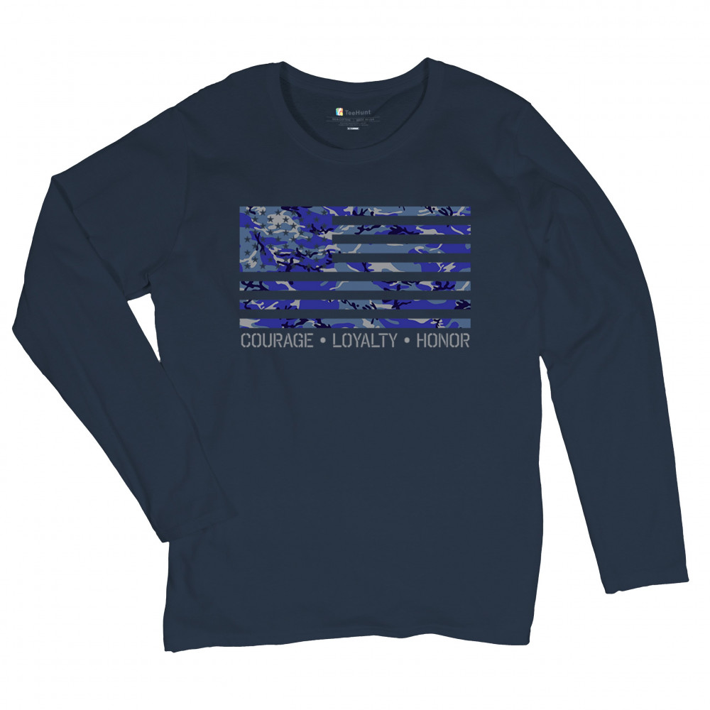 Patriotic shirt with blue camouflage USA flag and "Courage, Loyalty, Honor". Perfect for veterans and proud Americans. Ideal for Memorial Day and Veterans Day.