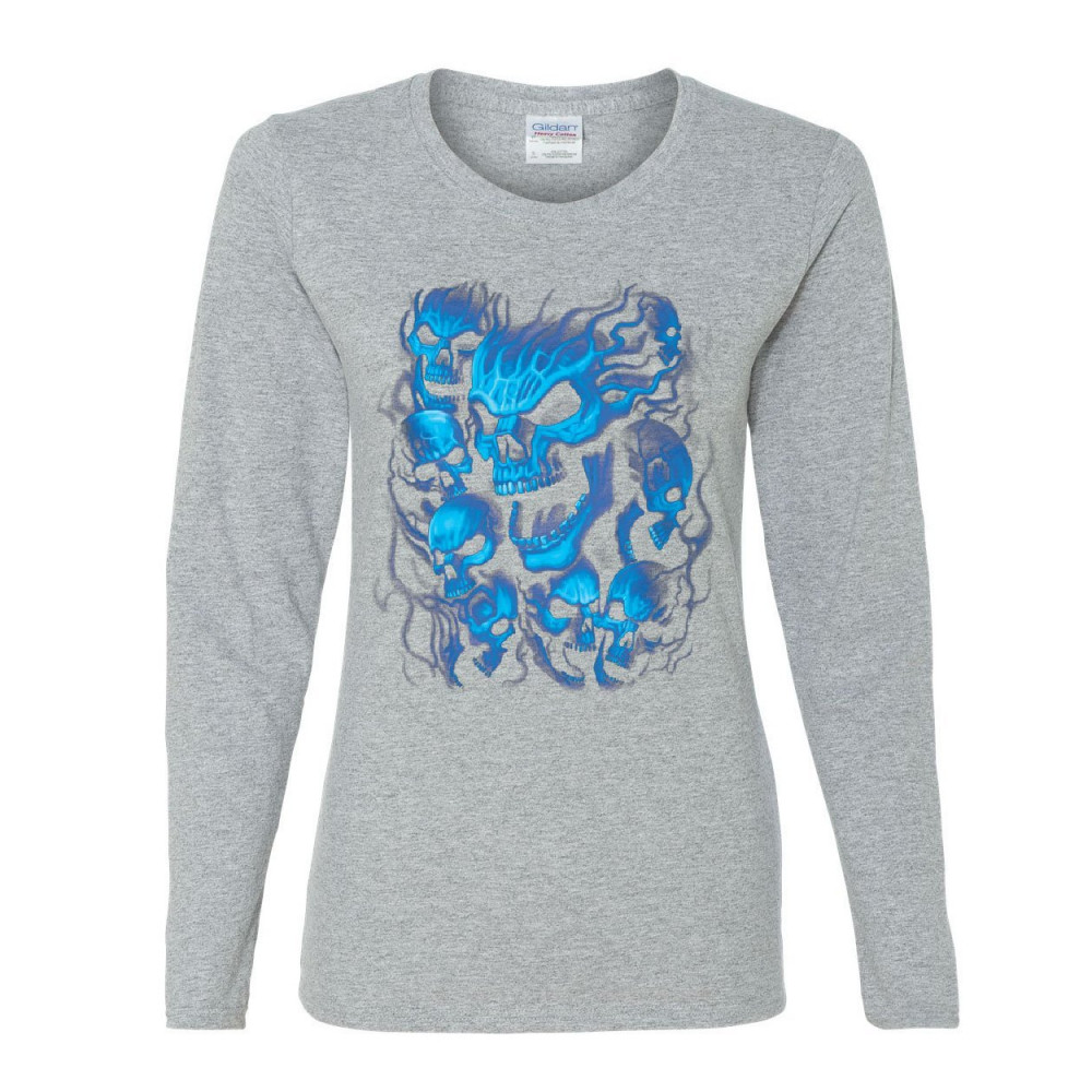 BLUE SKULLS women's long sleeve tee skull face death dead reaper hell evil demon gray