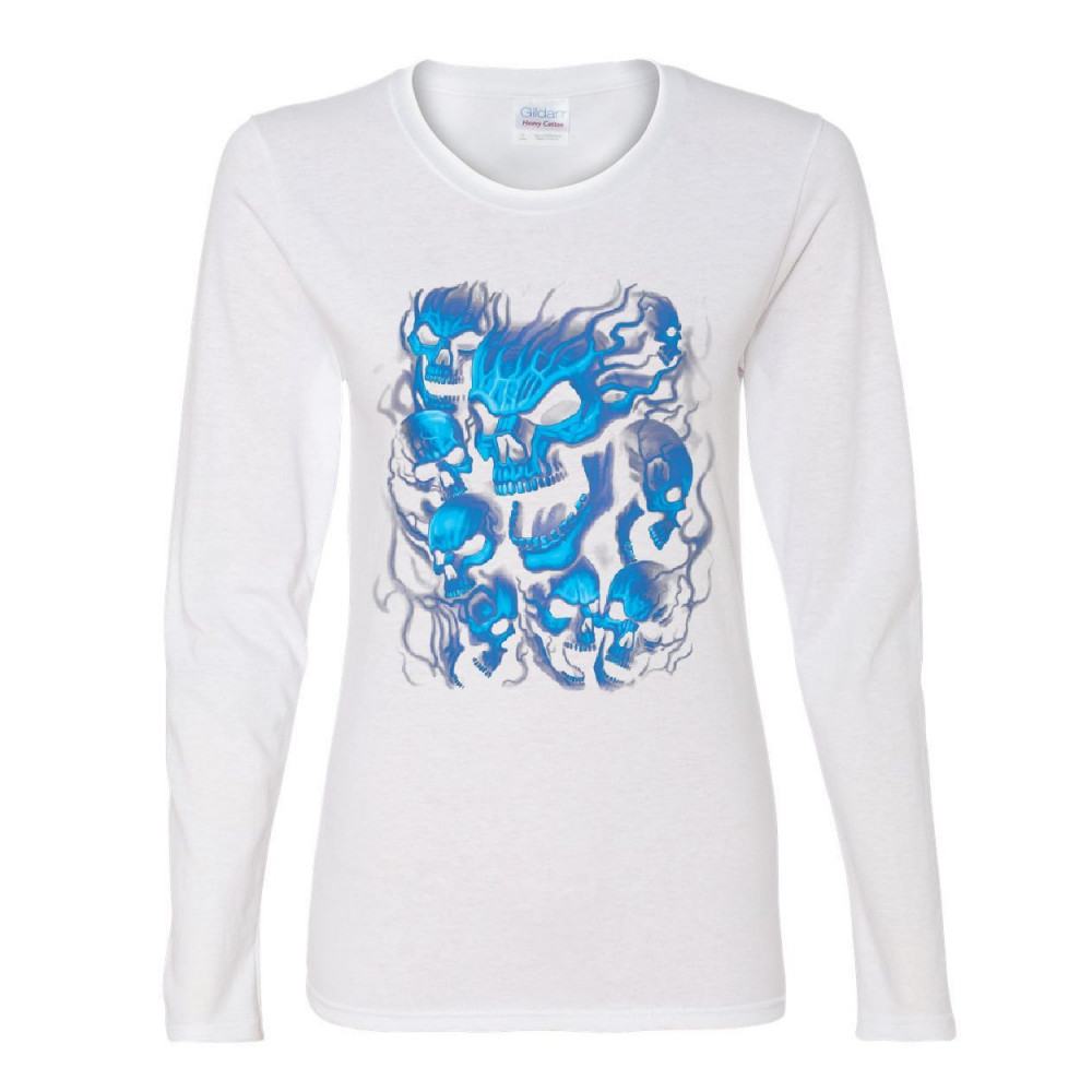 BLUE SKULLS women's long sleeve tee skull face death dead reaper hell evil demon white