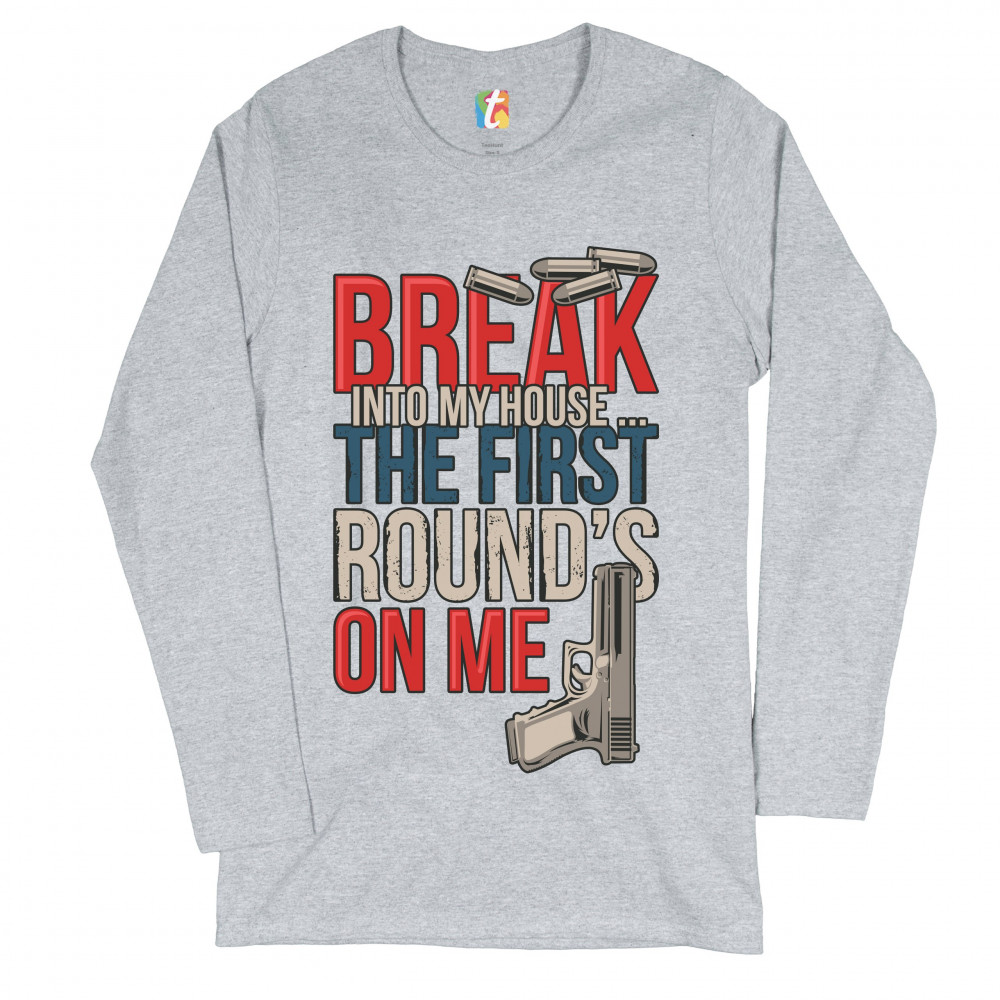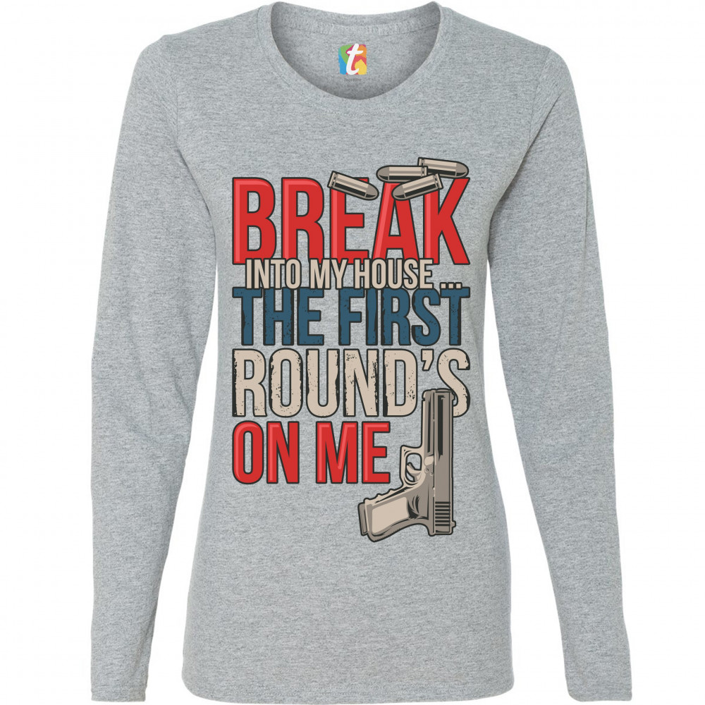 BREAK INTO MY HOUSE.. THE FIRST ROUND'S ON ME break into my house first round's on me women's long sleeve t-shirt funny 2a gray