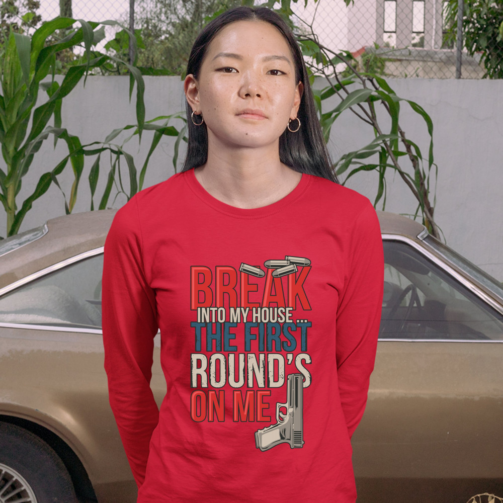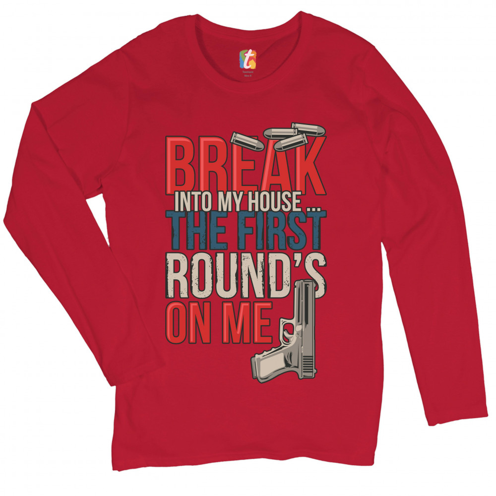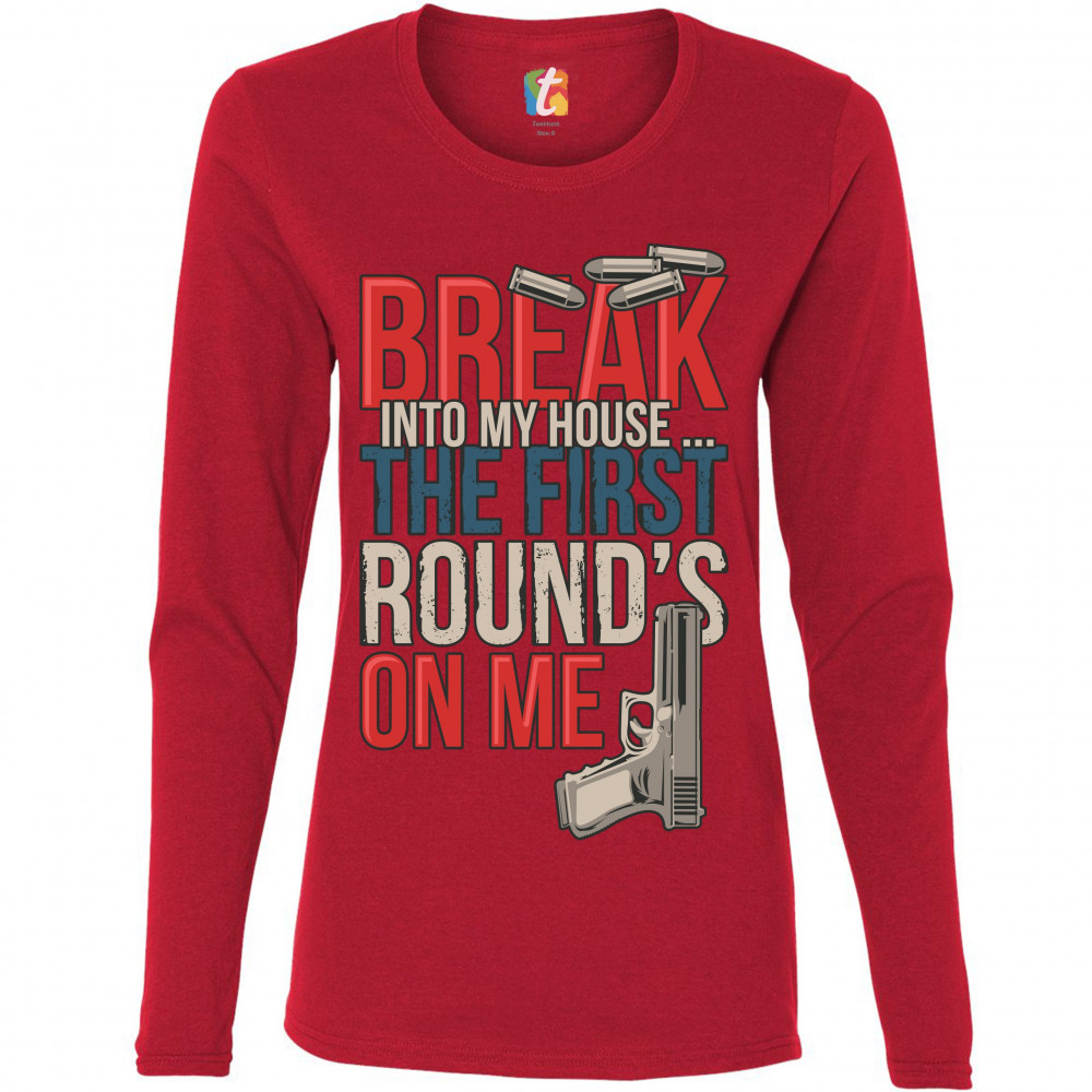 BREAK INTO MY HOUSE.. THE FIRST ROUND'S ON ME break into my house first round's on me women's long sleeve t-shirt funny 2a red