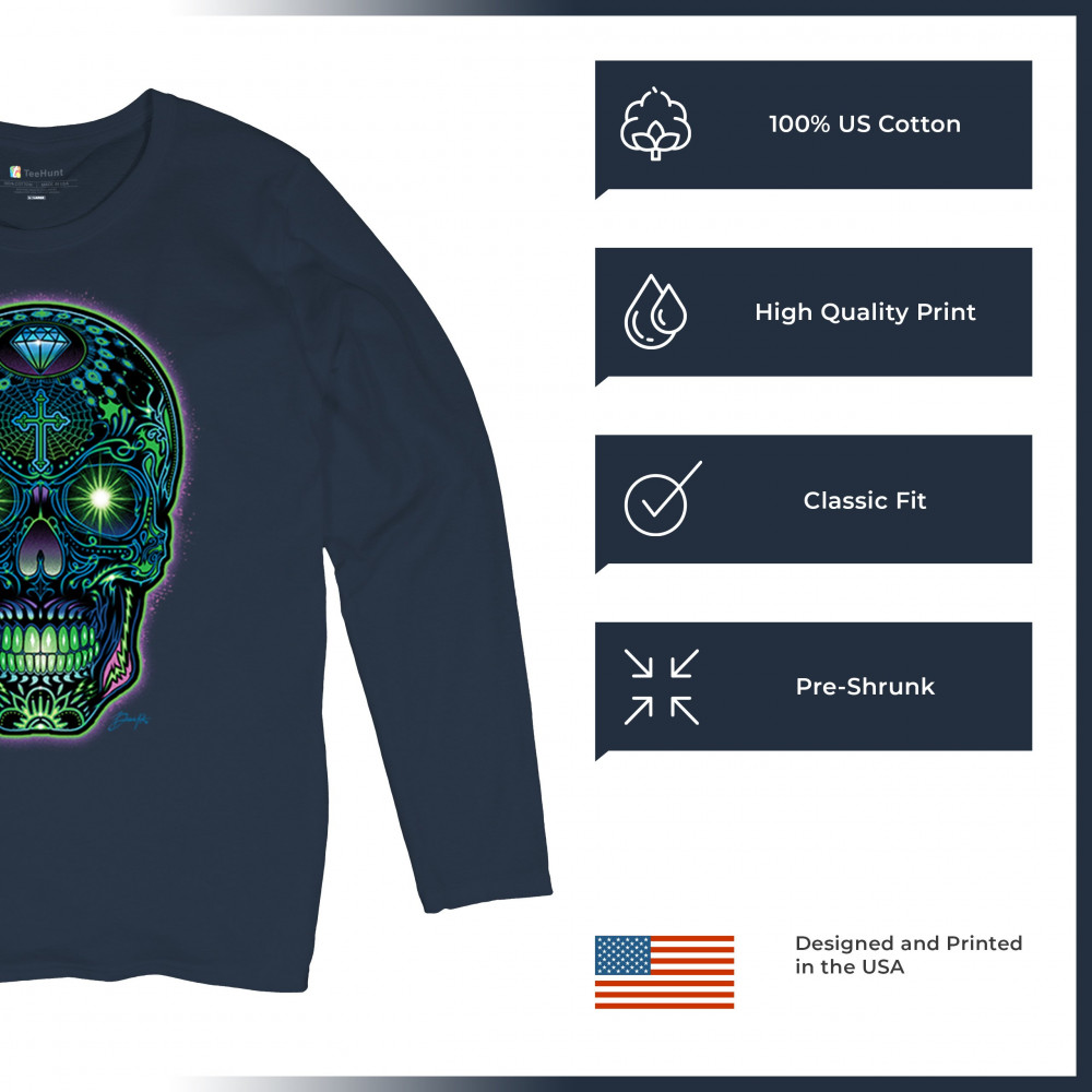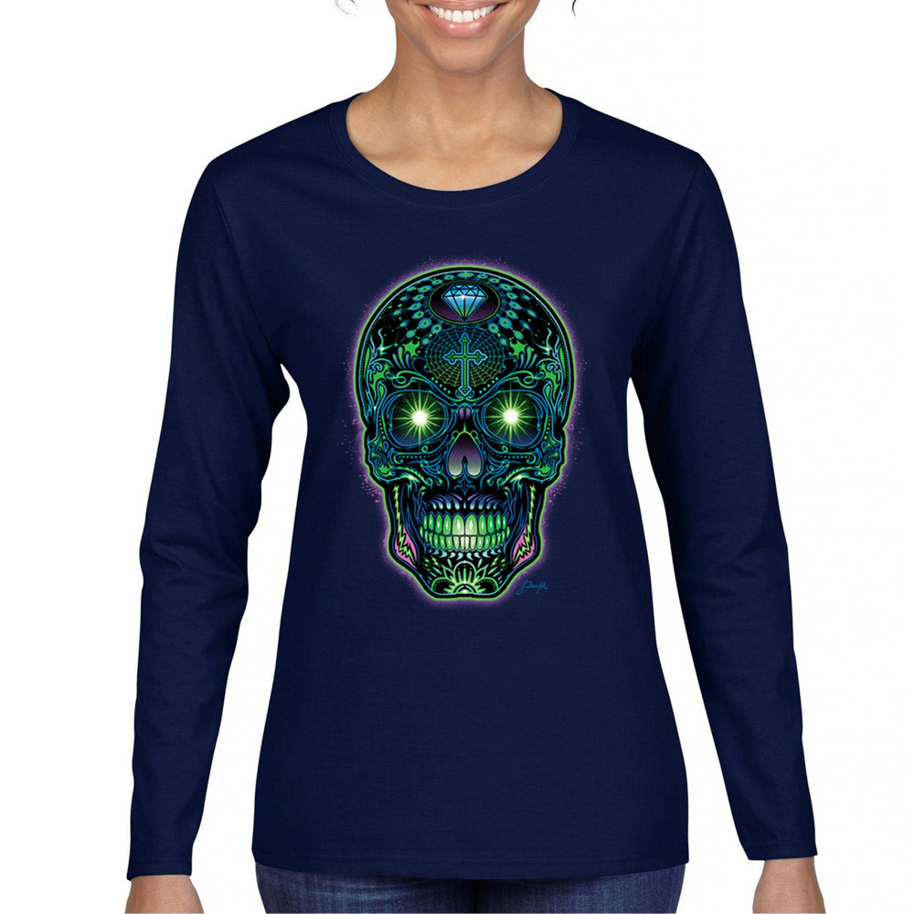 This electrified sugar skull design glows with neon energy and intricate details. Featuring green eyes, radiant cross, diamond, spider web, and vivid colors, it's a bold mash-up of psychedelic art, Day of the Dead tradition, and rave culture. A vibrant design perfect for skull fans and spiritual rebels alike.