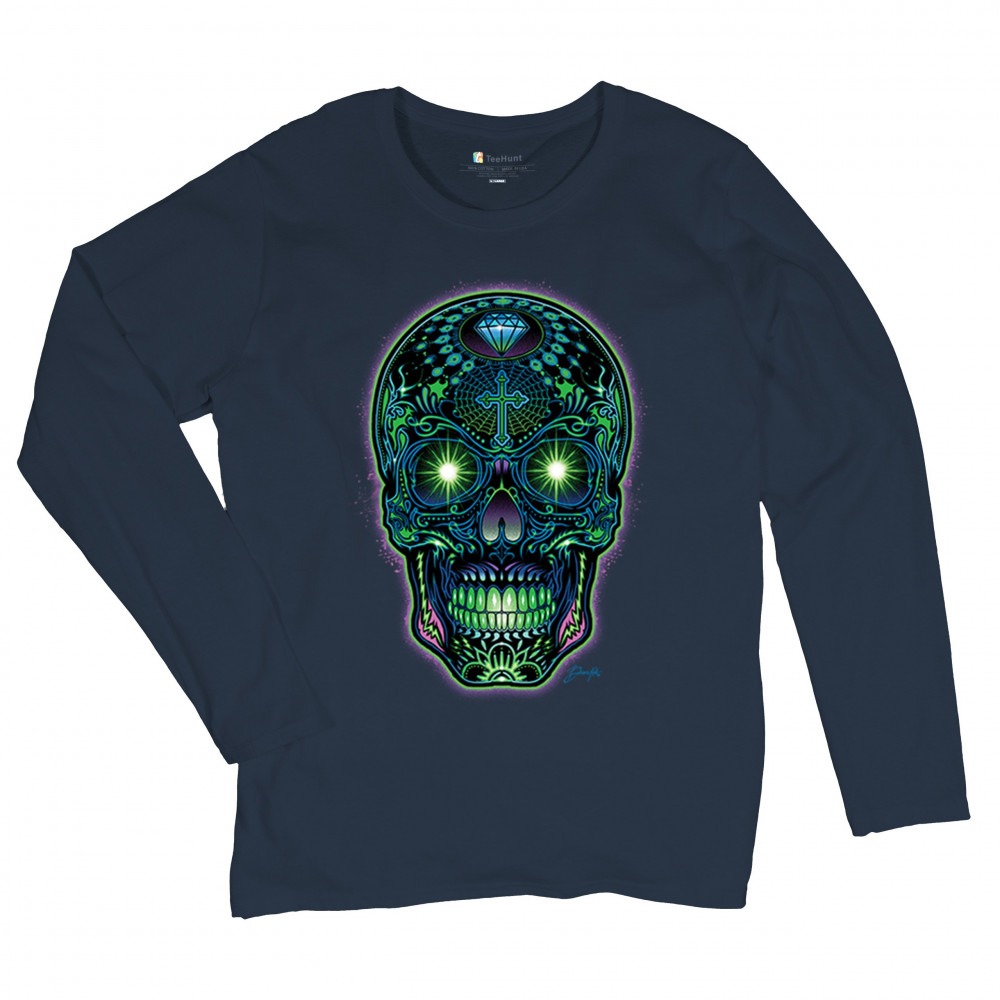 Electrified sugar skull with glowing green eyes, neon cross and diamond, perfect for rave lovers, skull art fans, and Day of the Dead style.