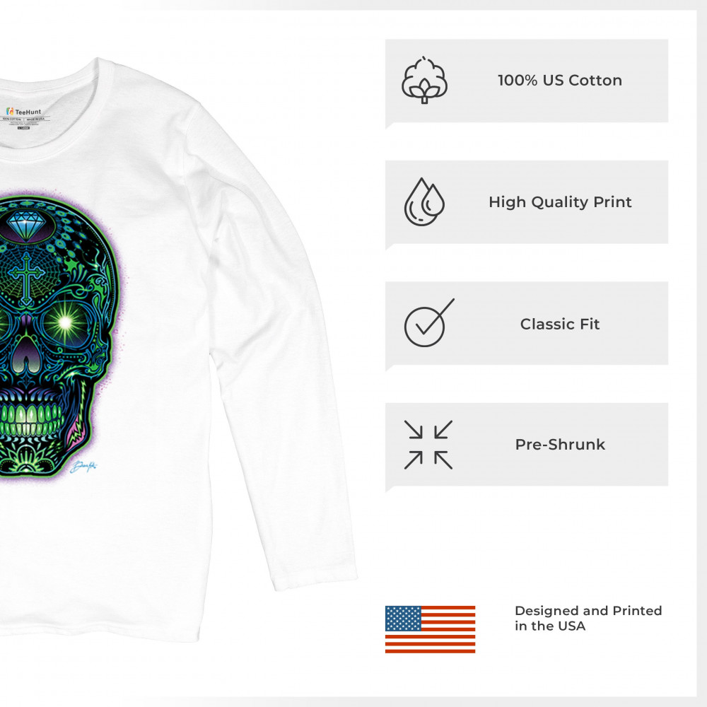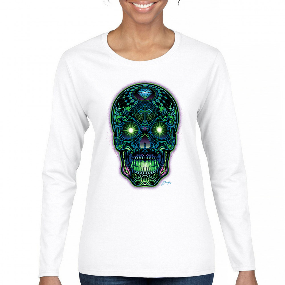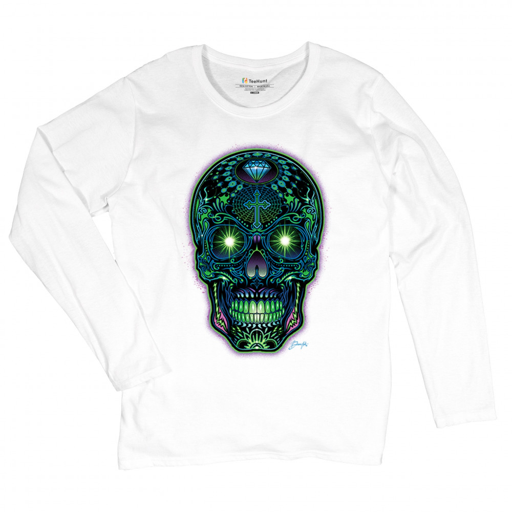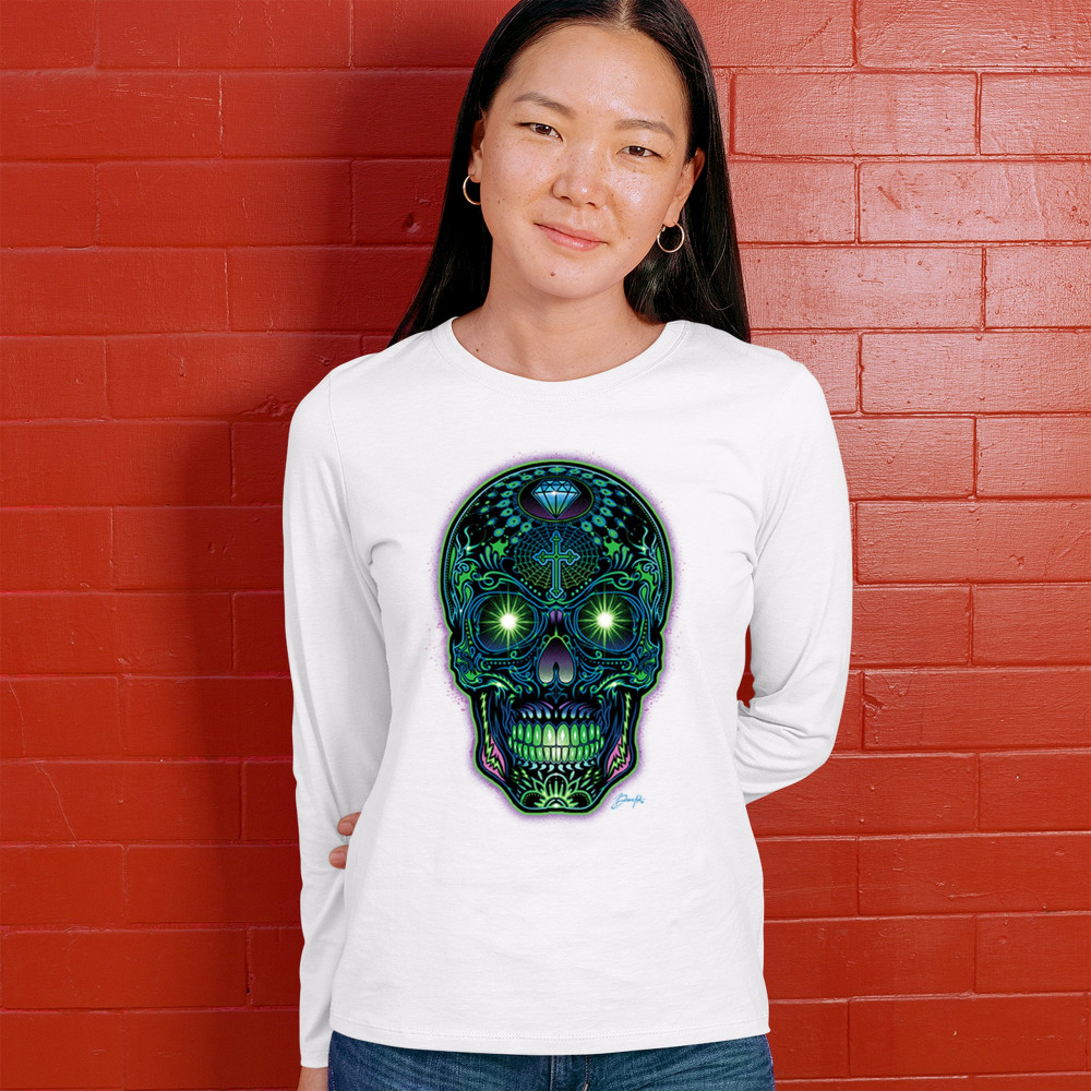 This electrified sugar skull design glows with neon energy and intricate details. Featuring green eyes, radiant cross, diamond, spider web, and vivid colors, it's a bold mash-up of psychedelic art, Day of the Dead tradition, and rave culture. A vibrant design perfect for skull fans and spiritual rebels alike.