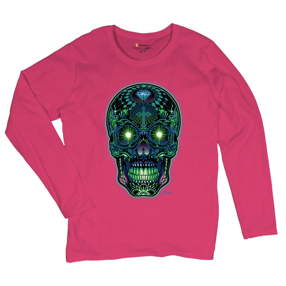 This electrified sugar skull design glows with neon energy and intricate details. Featuring green eyes, radiant cross, diamond, spider web, and vivid colors, it's a bold mash-up of psychedelic art, Day of the Dead tradition, and rave culture. A vibrant design perfect for skull fans and spiritual rebels alike.