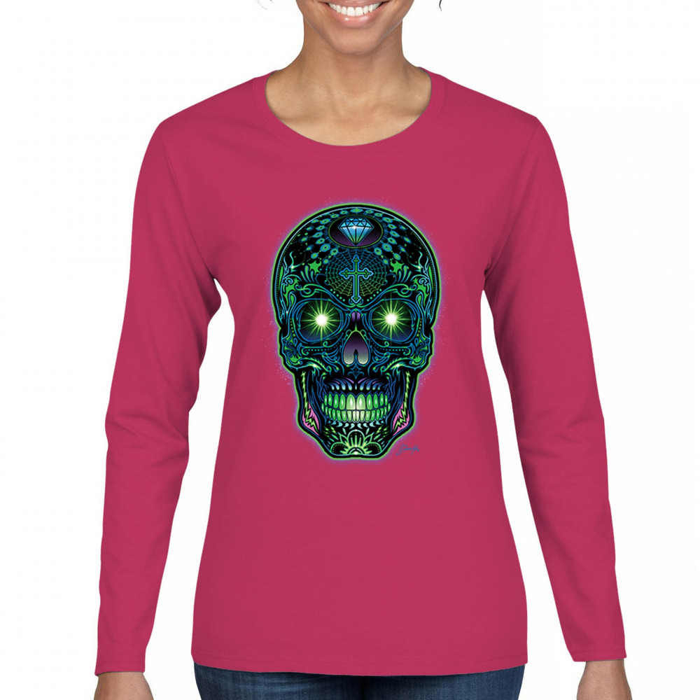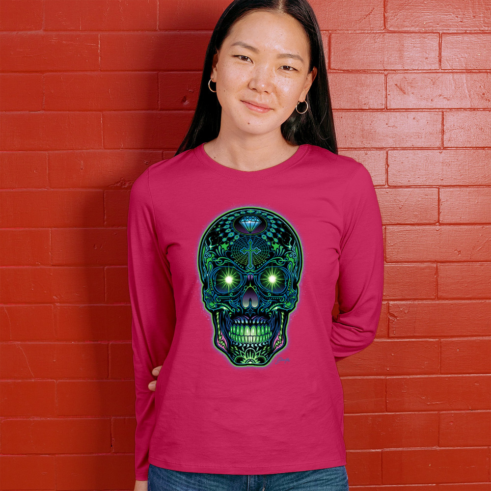 Electrified sugar skull with glowing green eyes, neon cross and diamond, perfect for rave lovers, skull art fans, and Day of the Dead style.