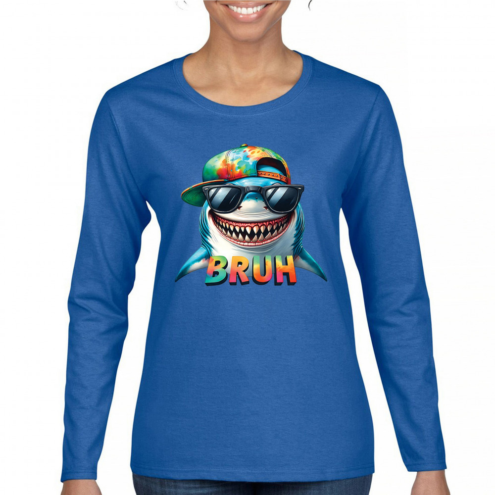 Bruh Shark meme shirt with Gen Z humor, cartoon shark design, summer beach vibes, Sigma Aura, and Italian Brainrot internet humor.