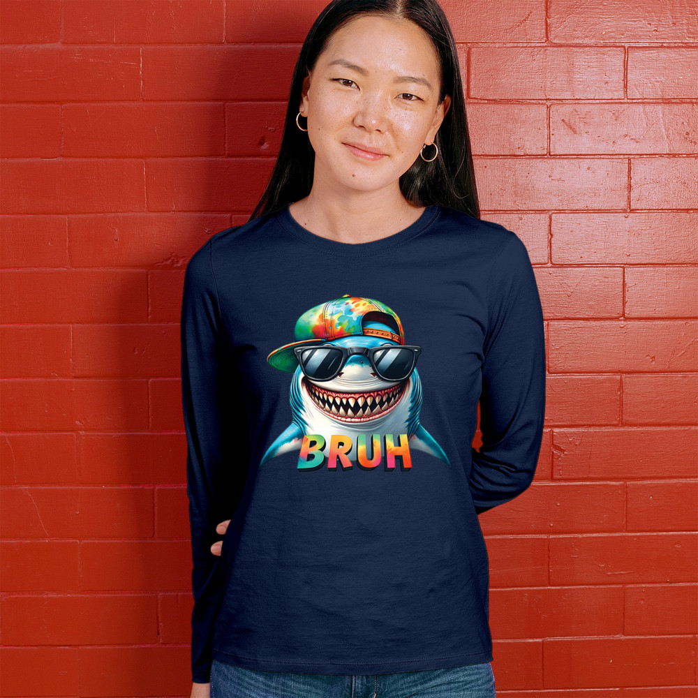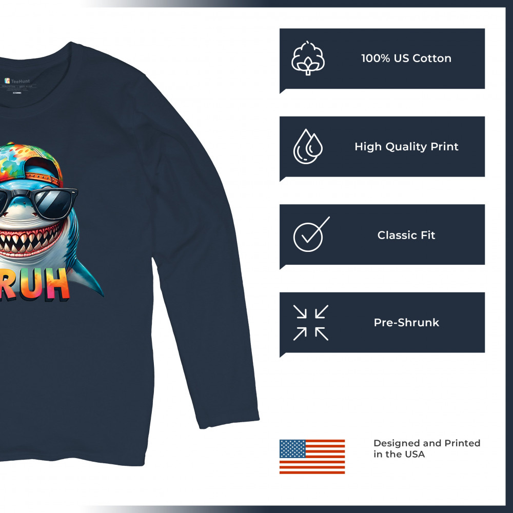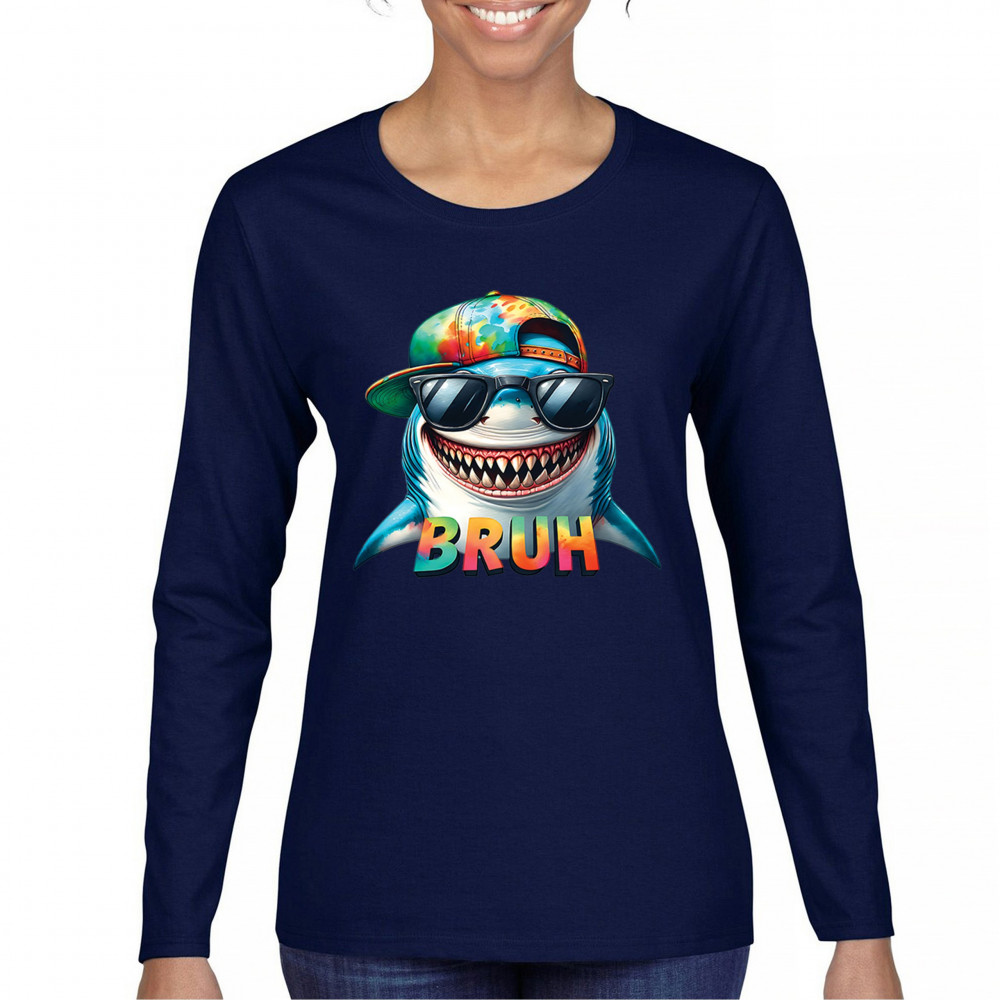 Bruh Shark meme shirt with Gen Z humor, cartoon shark design, summer beach vibes, Sigma Aura, and Italian Brainrot internet humor.