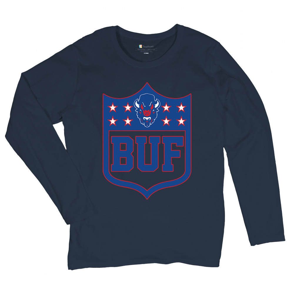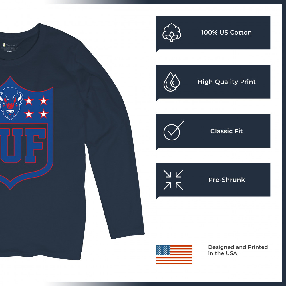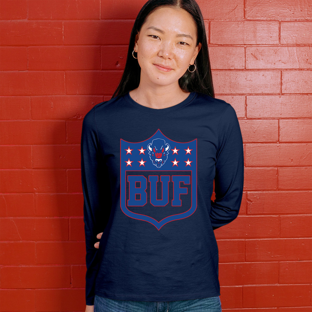 Bold Buffalo bison shield design for game day gear, tailgating, Sunday football, and championship pride in The Queen City.