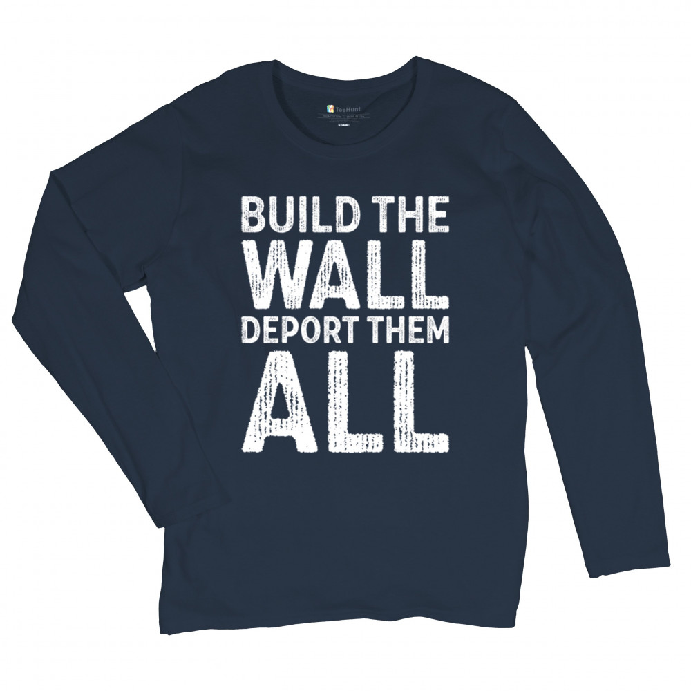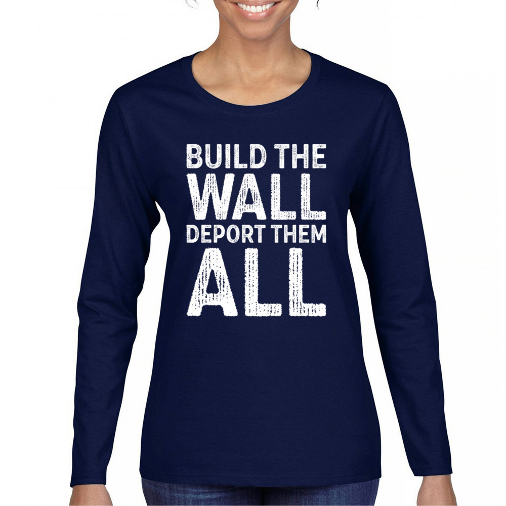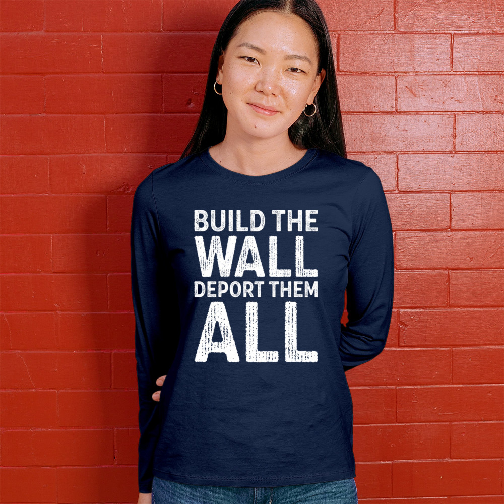 Stand strong for border security with our 'Build the Wall Deport Them All Trump 2024' tee. As a proud Trump supporter, join the America First movement and champion conservative values. Trust in God, not government, and reject the failed policies of Sleepy Joe. Let's go Brandon! Let the American flag wave high as we rally for victory in 2024.
