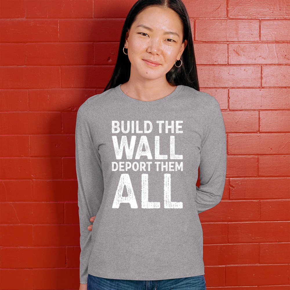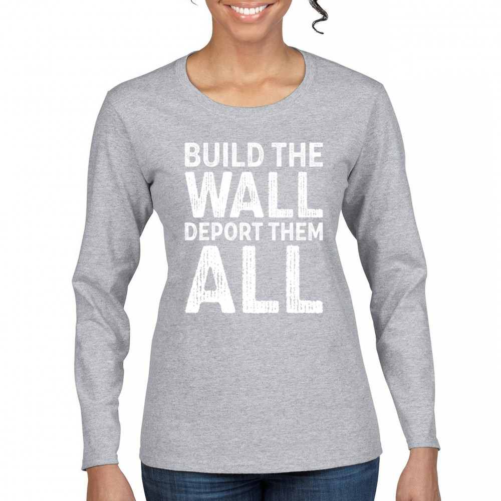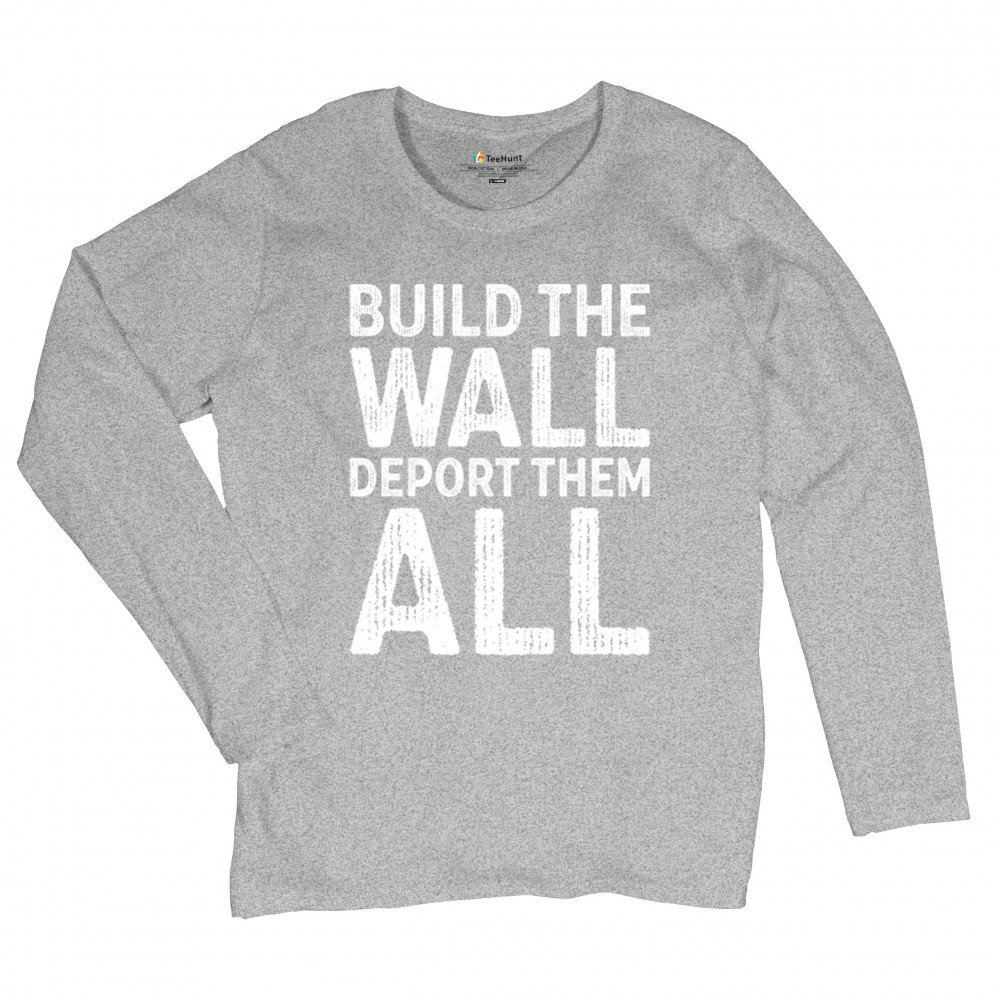 Stand strong for border security with our 'Build the Wall Deport Them All Trump 2024' tee. As a proud Trump supporter, join the America First movement and champion conservative values. Trust in God, not government, and reject the failed policies of Sleepy Joe. Let's go Brandon! Let the American flag wave high as we rally for victory in 2024.