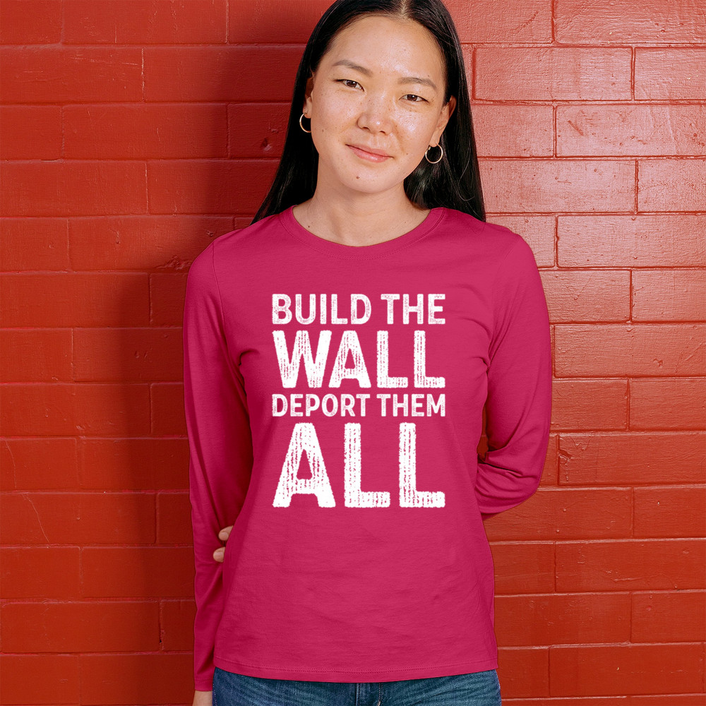 Stand strong for border security with our 'Build the Wall Deport Them All Trump 2024' tee. As a proud Trump supporter, join the America First movement and champion conservative values. Trust in God, not government, and reject the failed policies of Sleepy Joe. Let's go Brandon! Let the American flag wave high as we rally for victory in 2024.