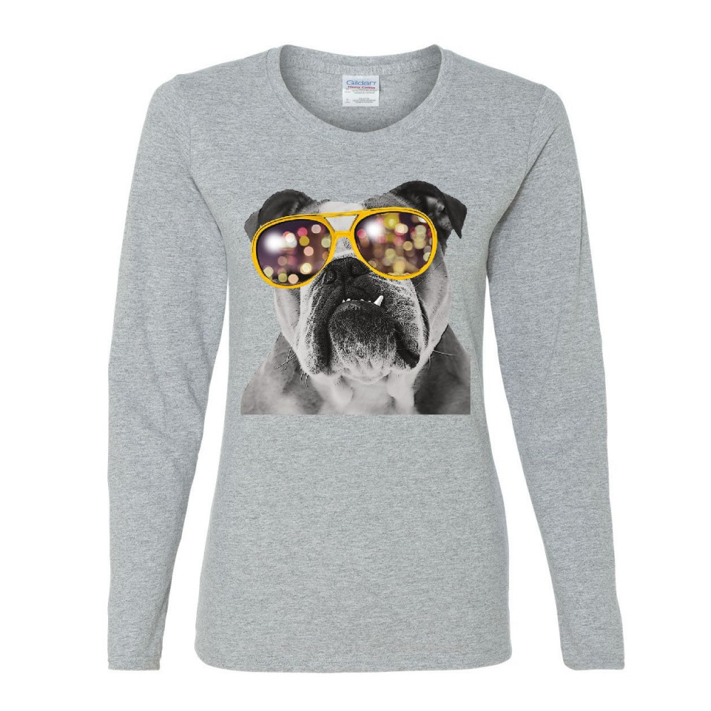 BULLDOG WEARING GLASSES women's long sleeve tee cute dog swag pet lovers urban gray
