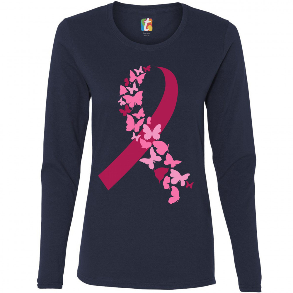 BUTTERFLIES PINK RIBBON women's long sleeve t-shirt breast cancer awareness navy blue
