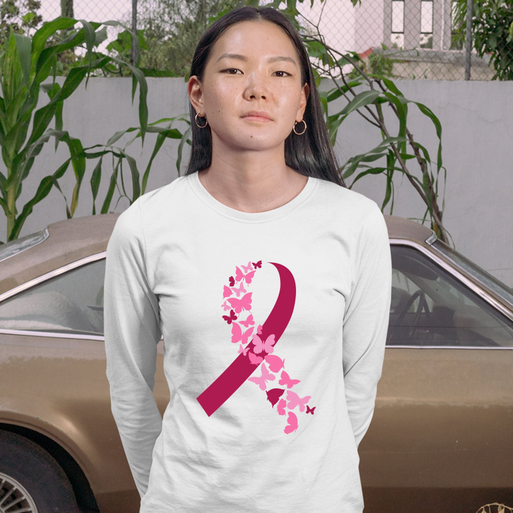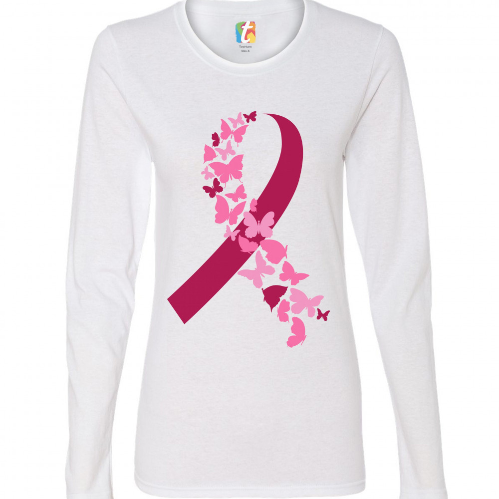 BUTTERFLIES PINK RIBBON women's long sleeve t-shirt breast cancer awareness white