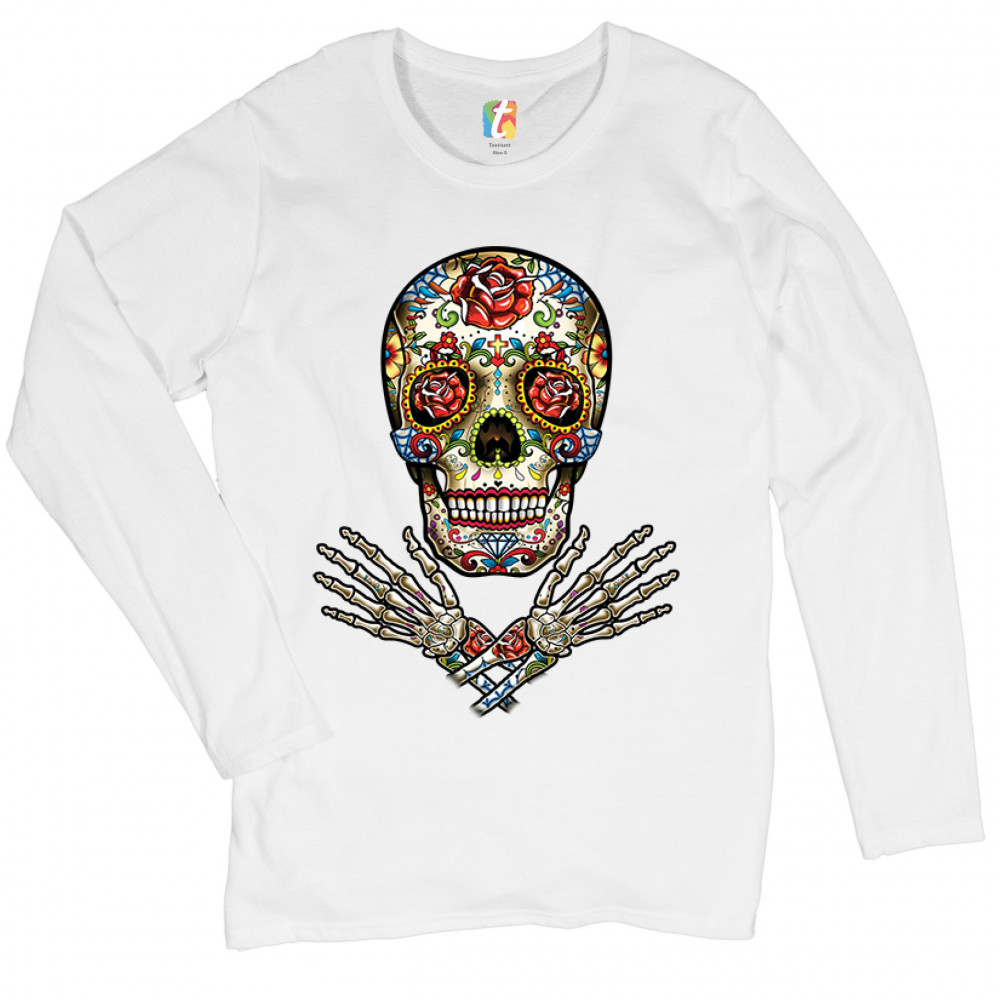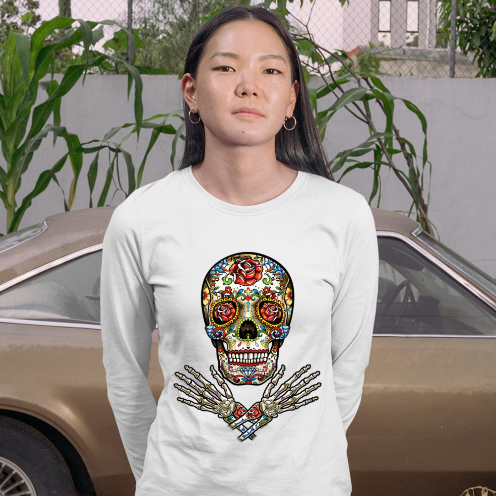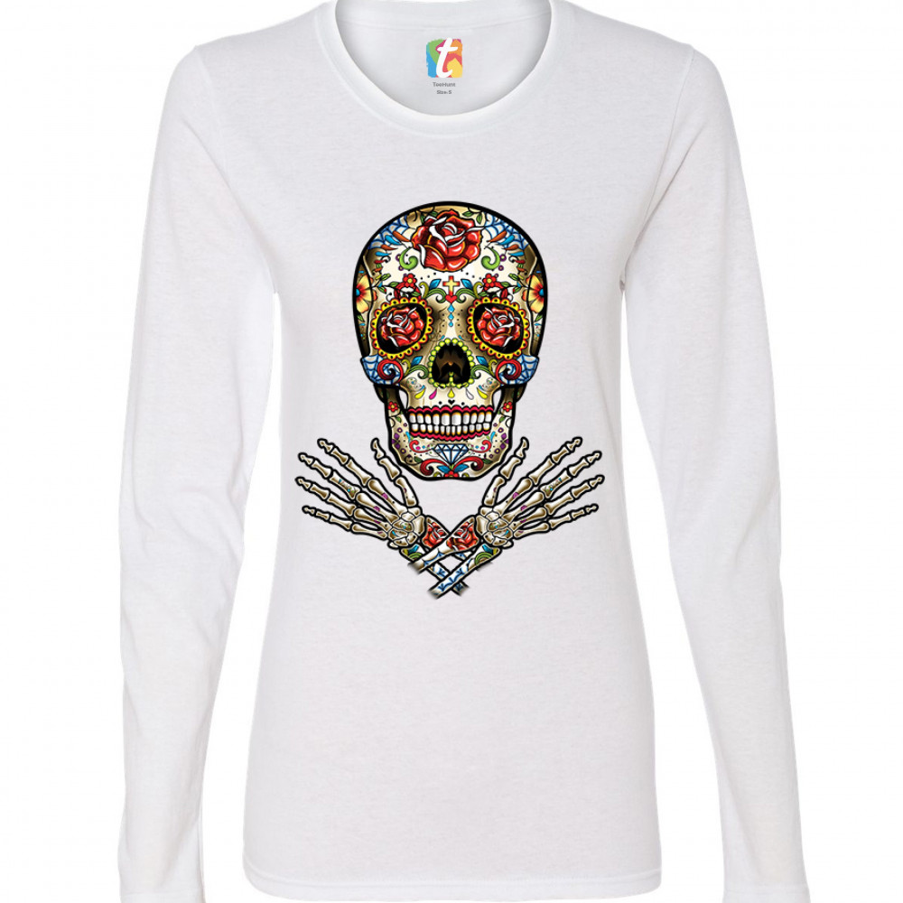 CALAVERA ARMS CROSSED calavera women's long sleeve t-shirt dia de los muertos day of the dead white