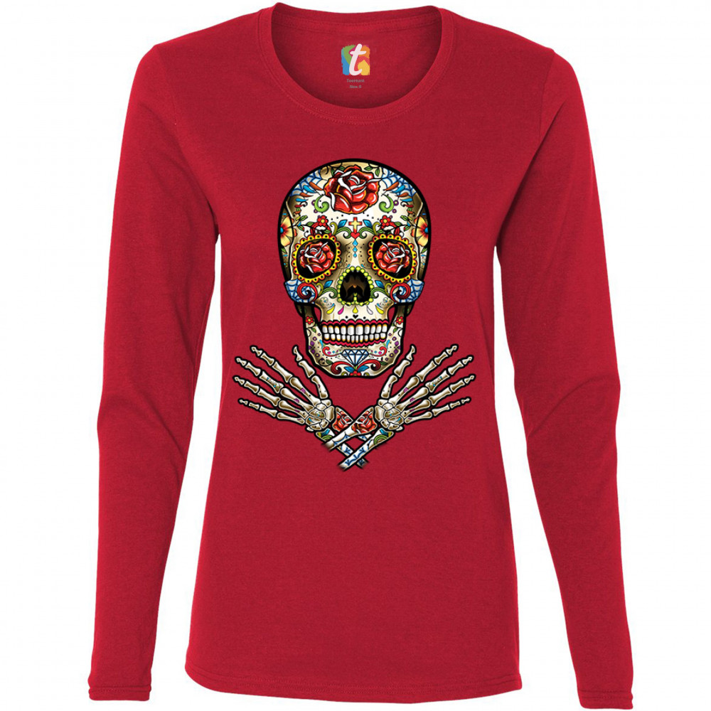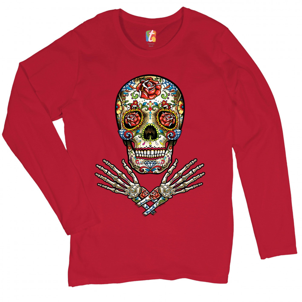 CALAVERA ARMS CROSSED calavera women's long sleeve t-shirt dia de los muertos day of the dead red