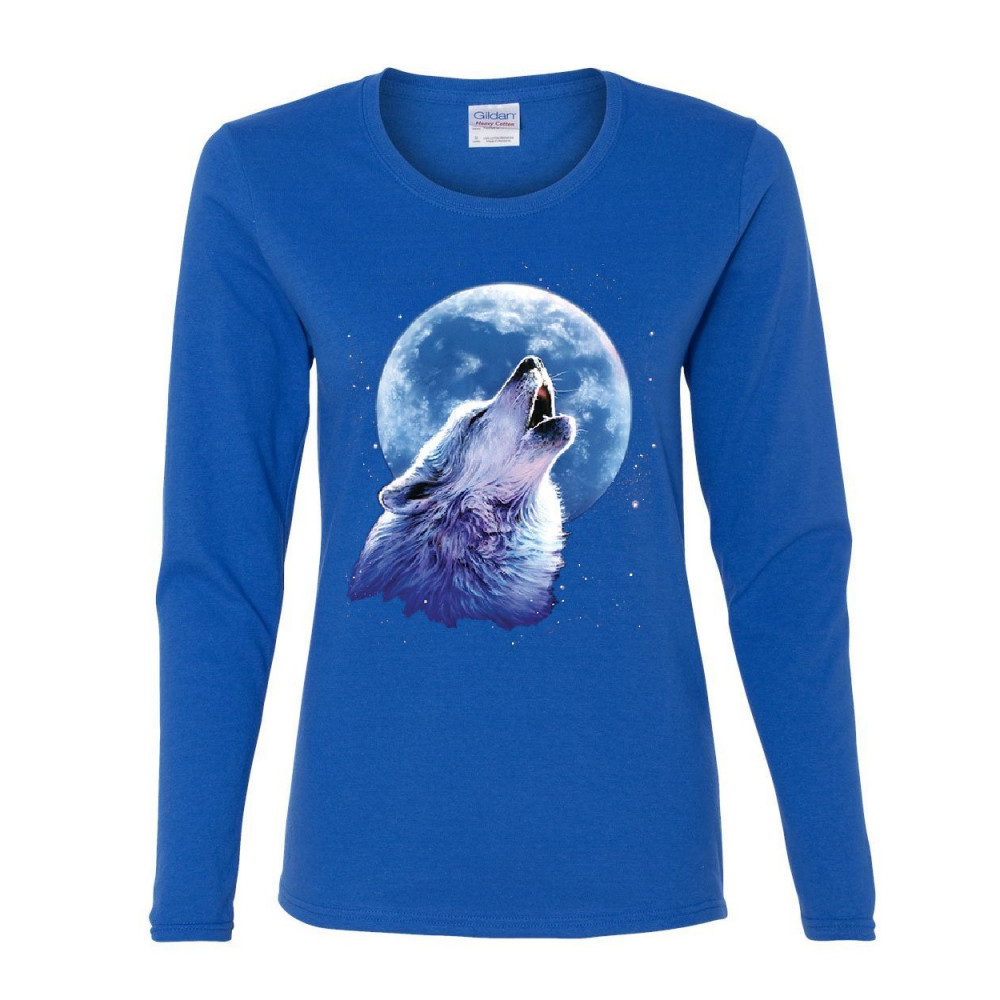 CALL OF THE WILD women's long sleeve tee lone wolf howling at the moon wildlife royal blue