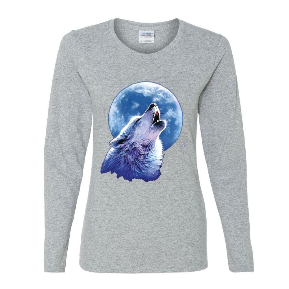 CALL OF THE WILD women's long sleeve tee lone wolf howling at the moon wildlife gray