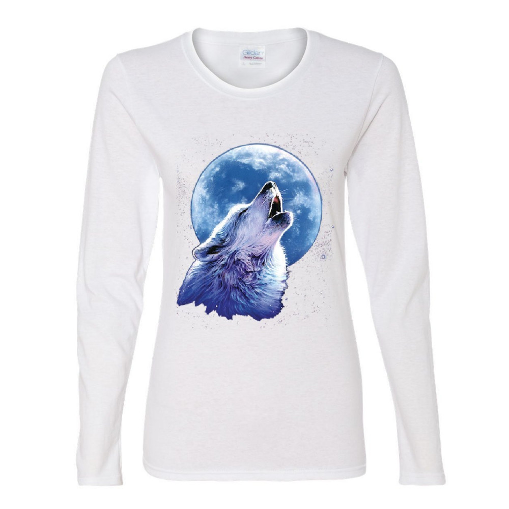 CALL OF THE WILD women's long sleeve tee lone wolf howling at the moon wildlife white