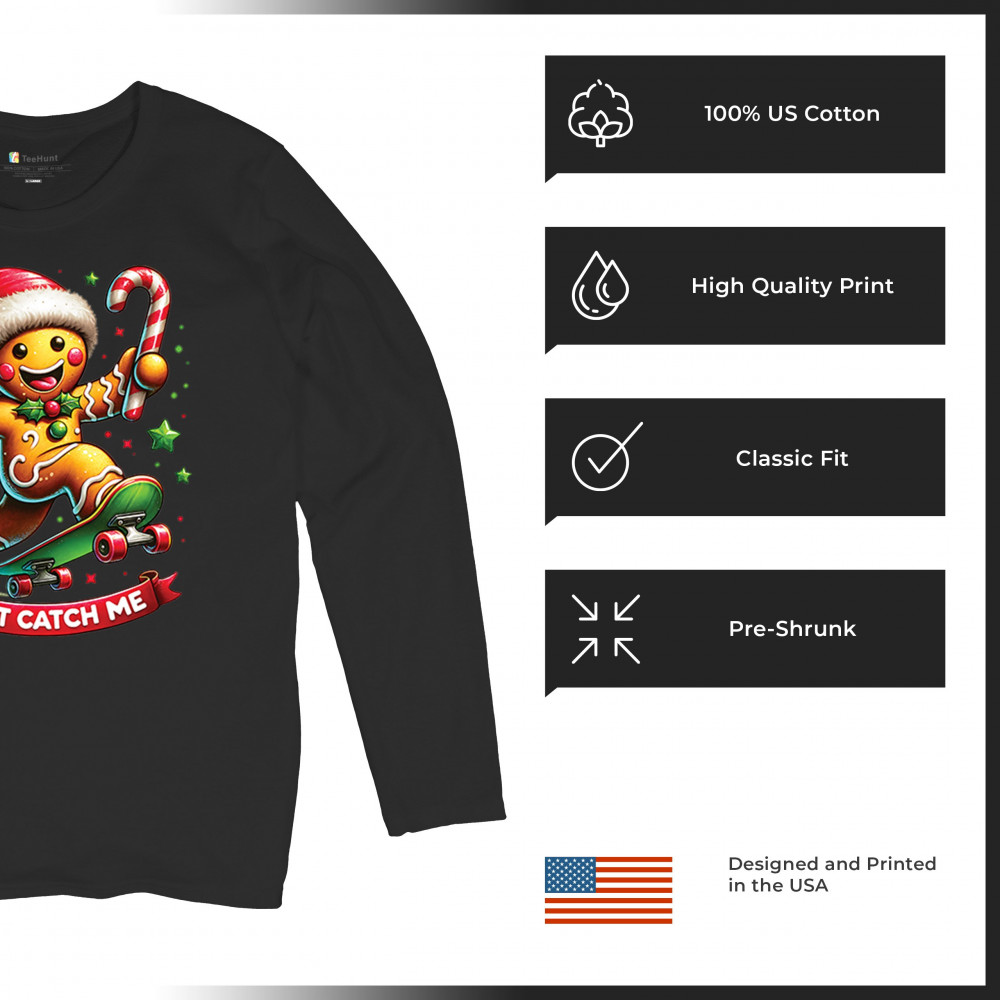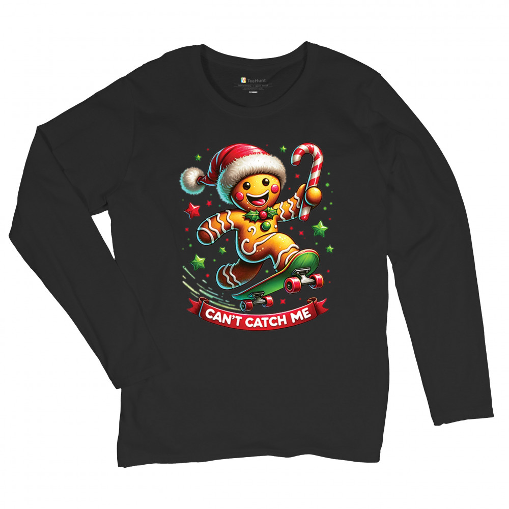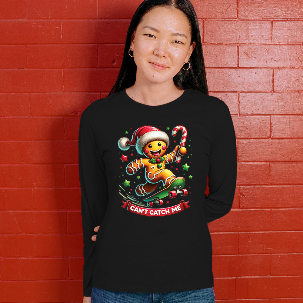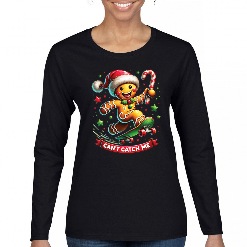 CAN'T CATCH ME GINGERBREAD MAN women's long sleeve t-shirt funny christmas jolly black