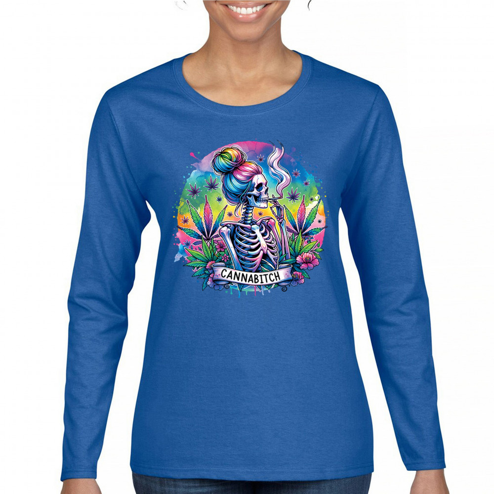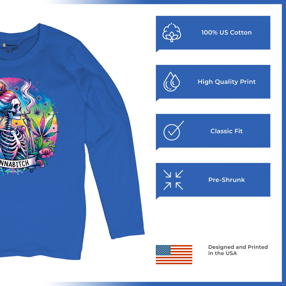 Unleash your inner weed queen with this CANNABITCH design—a psychedelic rainbow skeleton with major stoner girl energy. Dripping in neon colors, bold bud leaves, and fierce feminine vibes, it's a head-turning graphic for cannabis culture lovers, party girls, and unapologetically high women.