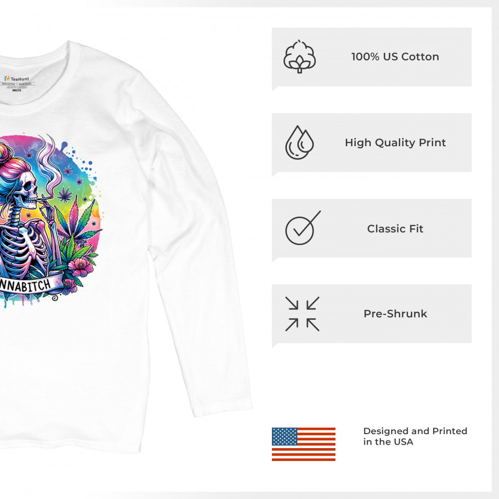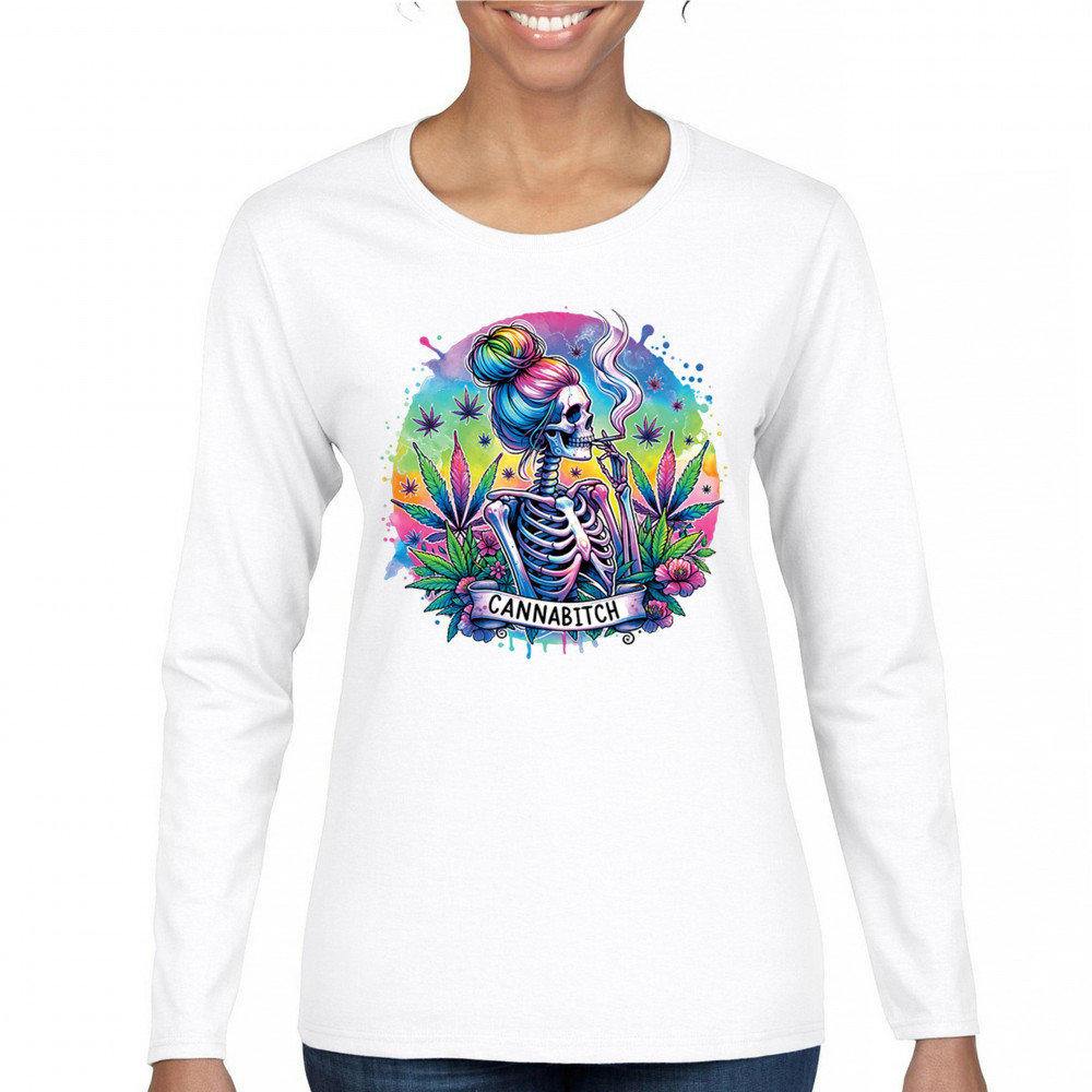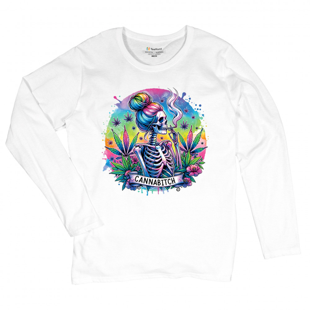 Unleash your inner weed queen with this CANNABITCH design—a psychedelic rainbow skeleton with major stoner girl energy. Dripping in neon colors, bold bud leaves, and fierce feminine vibes, it's a head-turning graphic for cannabis culture lovers, party girls, and unapologetically high women.