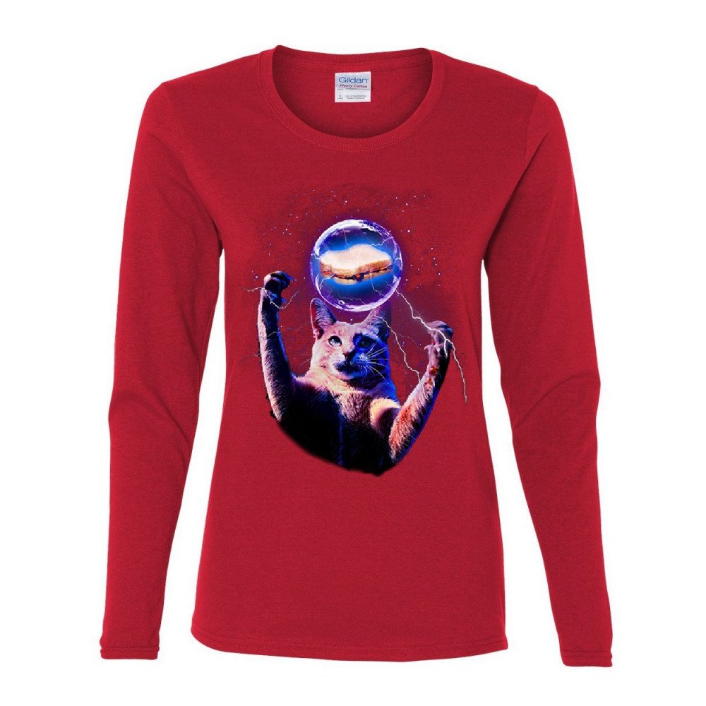CAT CATCHING A PB&J cat catching a sandwich women's long sleeve tee plasma ball kitty kitten weird red