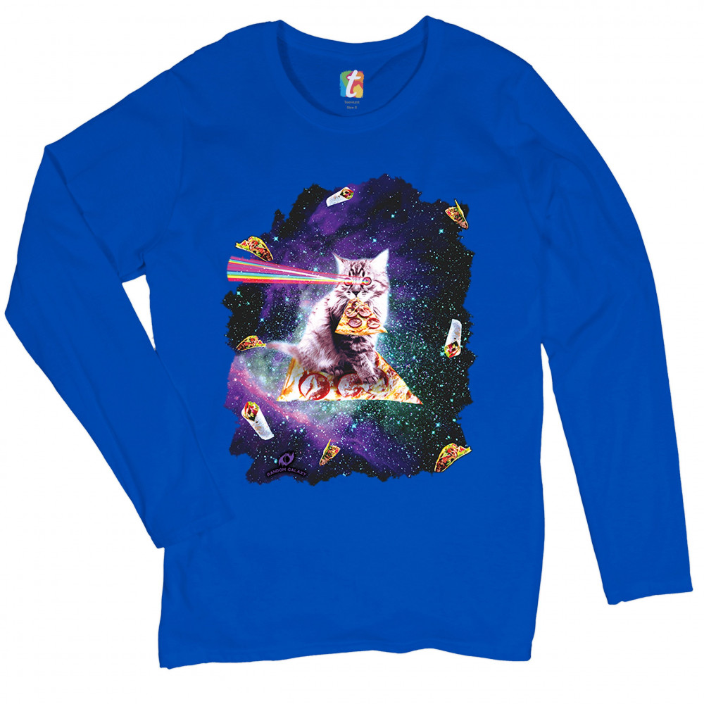 CAT FIRING RAINBOW LASER RIDING PIZZA SLICE IN SPACE cat firing lasers riding pizza slice in space women's long sleeve t-shirt weird royal blue