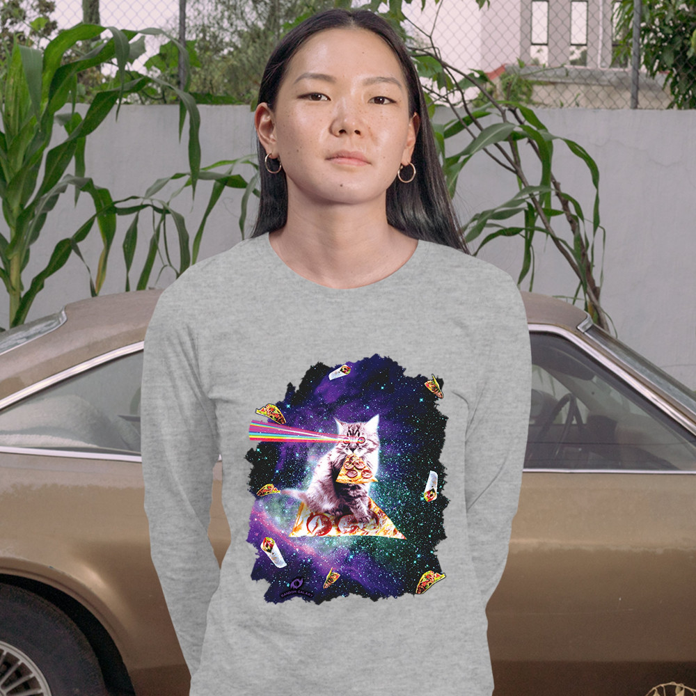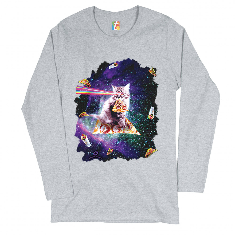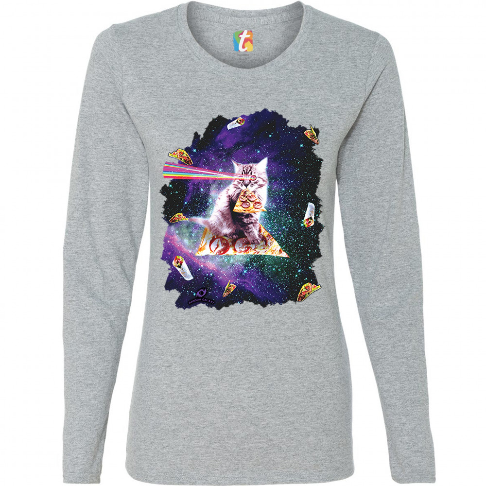 CAT FIRING RAINBOW LASER RIDING PIZZA SLICE IN SPACE cat firing lasers riding pizza slice in space women's long sleeve t-shirt weird gray