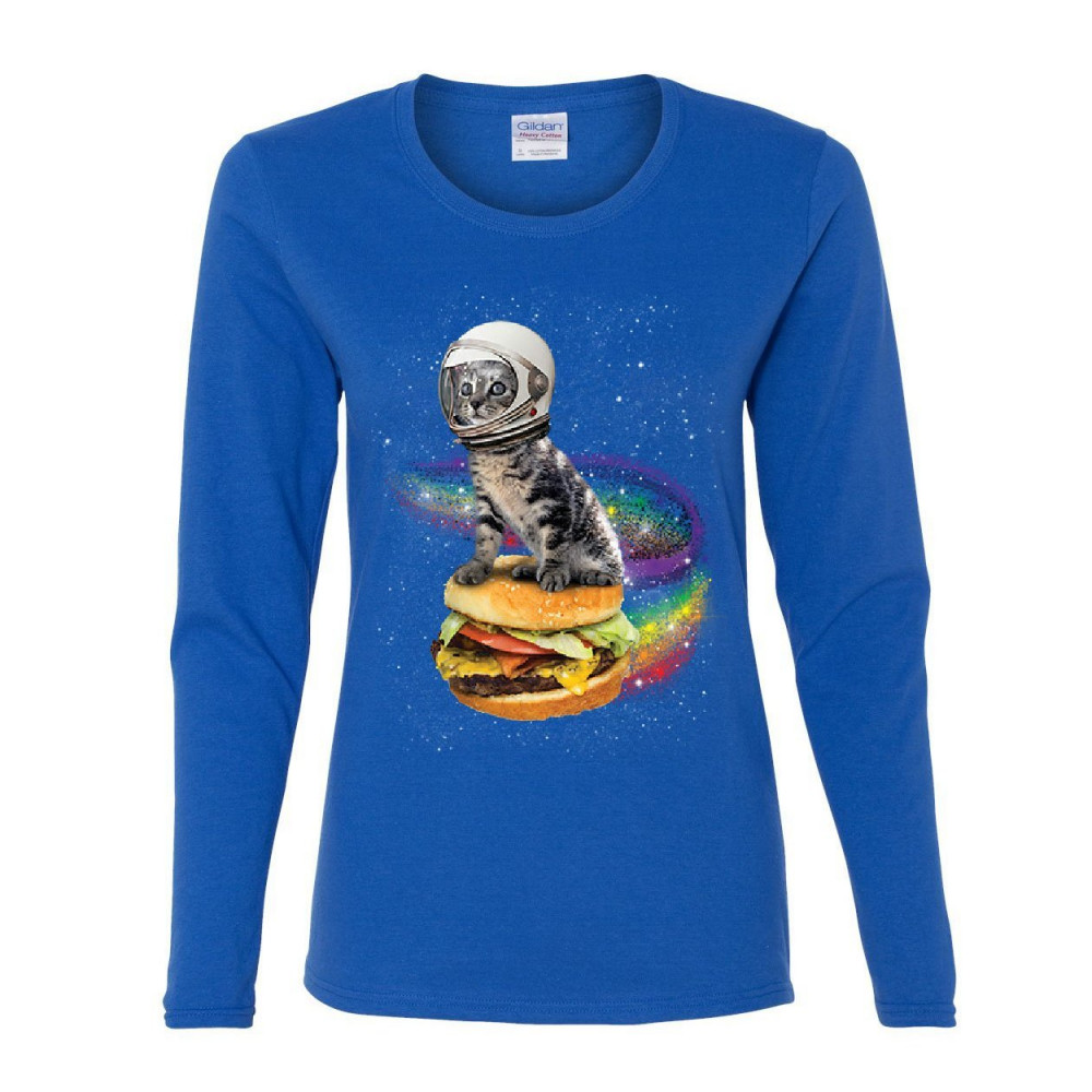 CAT FLYING A RAINBOW BURGER women's long sleeve tee funny astronaut kitten space royal blue